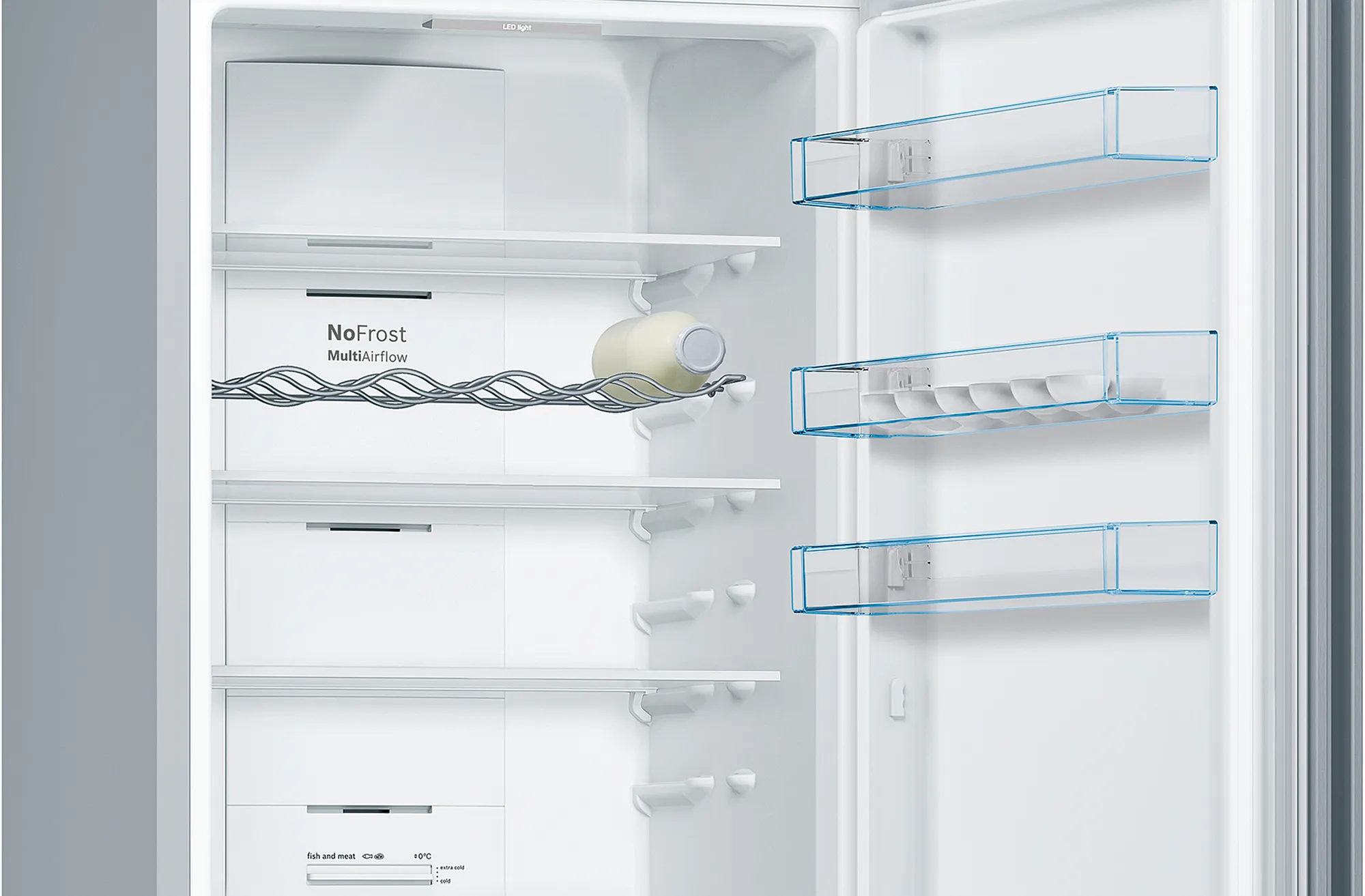 Zastosowanie diod LED to zupełnie nowa koncepcja oświetlenia wnętrza chłodziarki zapewniająca równomierne rozłożenie światła w jej wnętrzu. Trwałe, energooszczędne diody LED automatycznie oświetlają wnętrze wspaniałym białym światłem oraz zapewniają komfortowe jasne, jednolite i nieoślepiające oświetlenie wnętrza. Oświetlenie LED pomaga mieć oko na wszystko w lodówce.