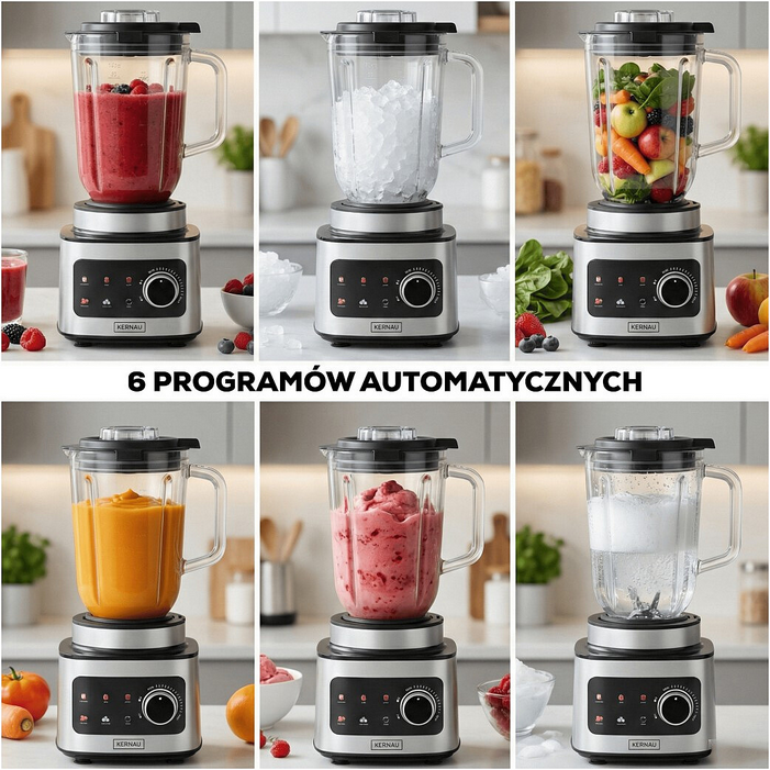 - Funkcje dodatkowe 6 programów automatycznych (smoothie, kruszenie lodu, warzywa i owoce, purée, lody, czyszczenie)