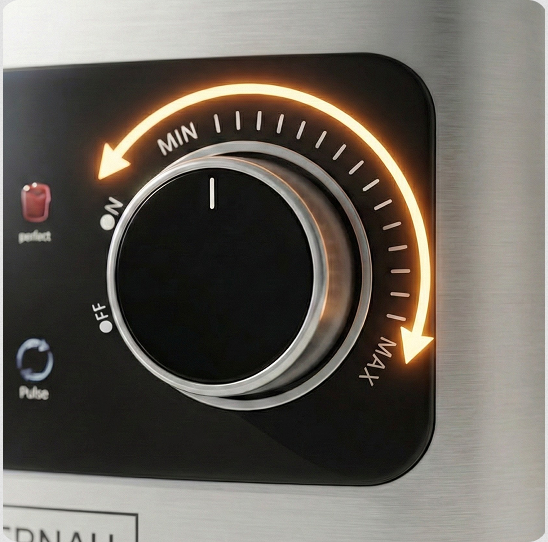 Poza specjalnymi trybami, blender oferuje 10-stopniową regulację prędkości, sterowaną za pomocą wygodnego pokrętła. Dzięki temu z łatwością dopasujesz intensywność pracy do rodzaju składników – od delikatnego blendowania owoców po intensywne rozdrabnianie twardszych produktów.