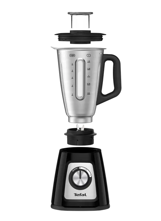 Trzeba zwrócić uwagę na fakt, że blender kielichowy TEFAL BL44E8 wyposażony jest w podwójną miarkę. Z jednej strony znajduje się podziałka wskazująca, ile kubków dowolnej cieczy czy też ziaren wsypało się do urządzenia, a druga jest klasyczną miarą wskazującą na ilość wyrażoną w jednostce, jaką jest litr. Oczywiście blender można przykryć pokrywką, dzięki której nic nie wydobywa się z urządzenia w trakcie rozdrabniania, miksowania czy kruszenia