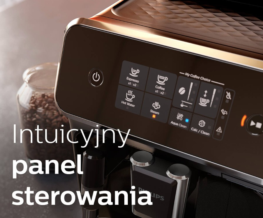 Ekspres Philips 2200 posiada czytelny, dotykowy panel sterowania, który sprawia, że obsługa urządzenia jest wyjątkowo prosta. Wystarczy wybrać rodzaj kawy i dotknąć odpowiednią ikonkę, a aromatyczny napój zostanie błyskawicznie zaparzony!