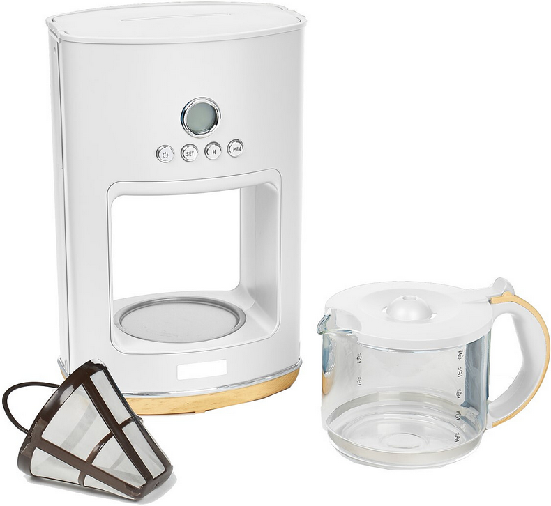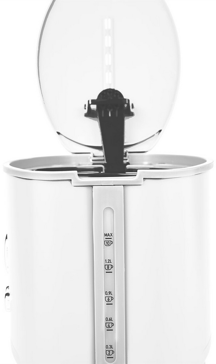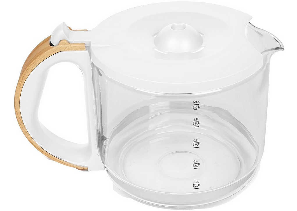 W zestawie znajduje się szklany dzbanek w którym można przygotować do 10 filiżanek kawy na raz. Wskaźnik poziomu wody określa zarówno liczbę filiżanek, jak i objętość kawy w litrach. Ekspres posiada funkcję Anti-Drip, dzięki której krople kawy nie będą na niego kapać, gdy usuniemy dzbanek.