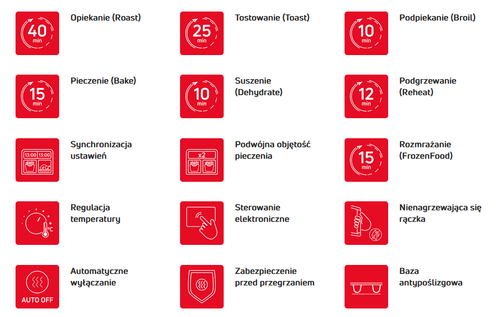 - Dodatkowe funkcje Funkcja suszenia, Podpiekanie, Podgrzewanie, Rozmrażanie