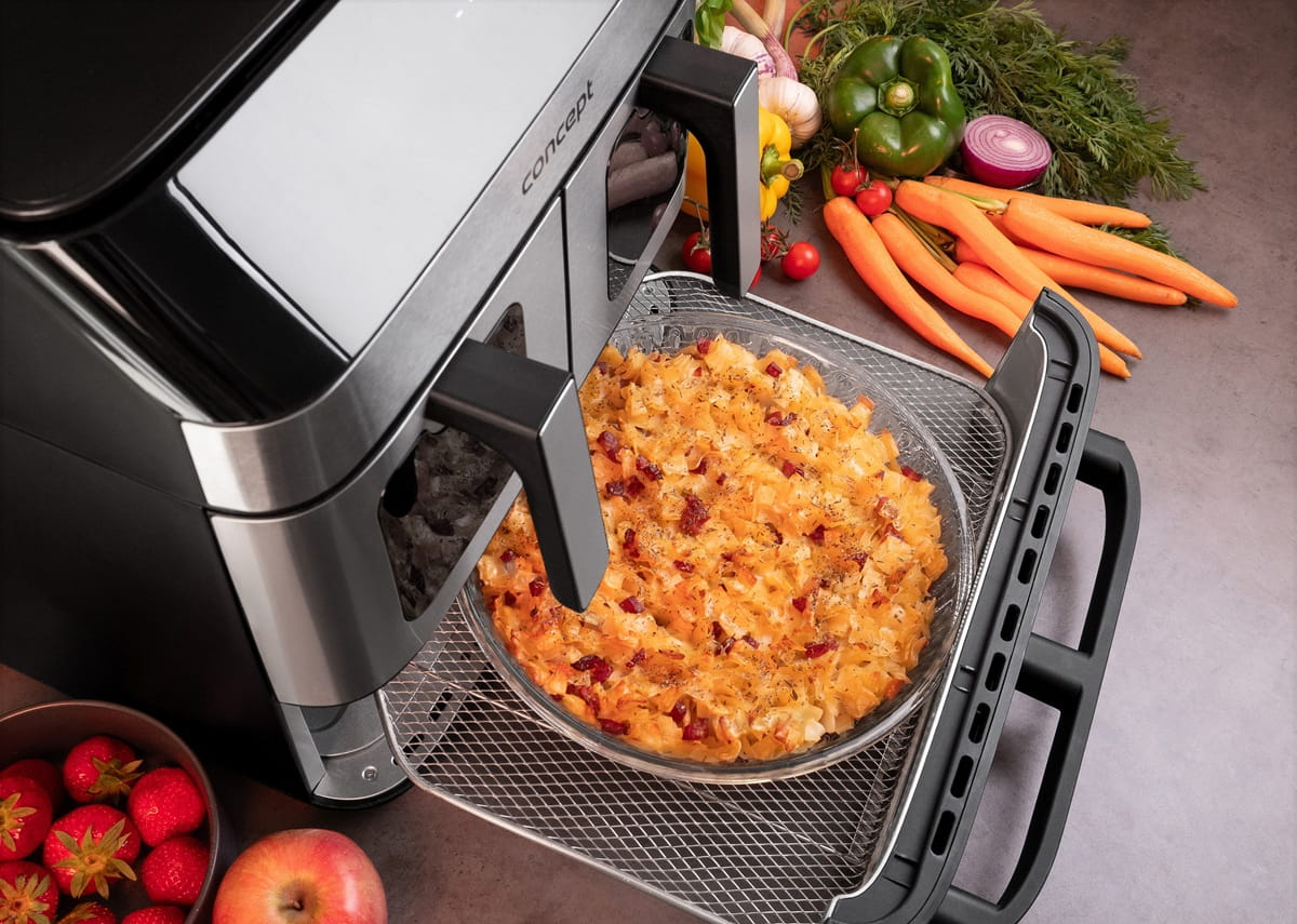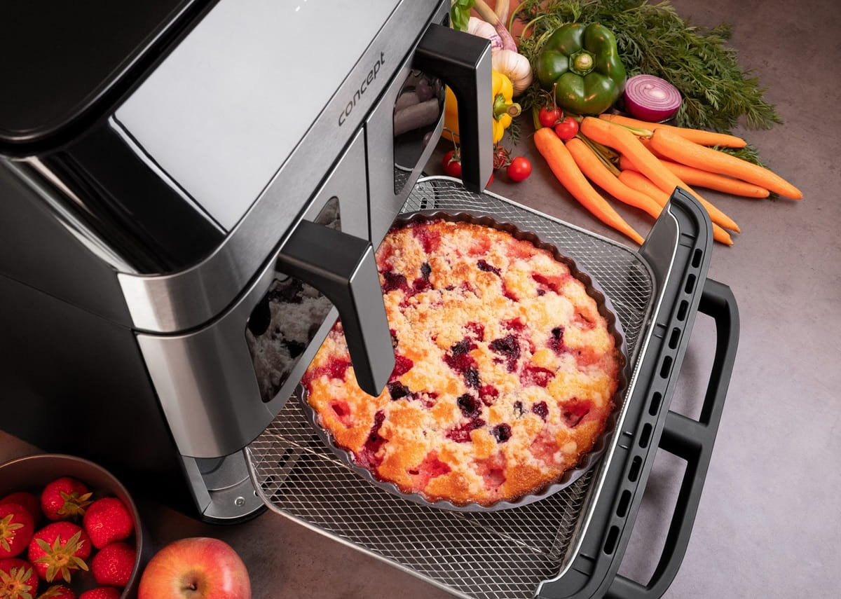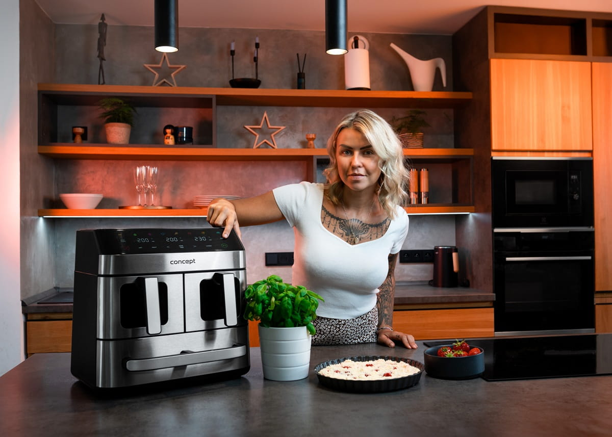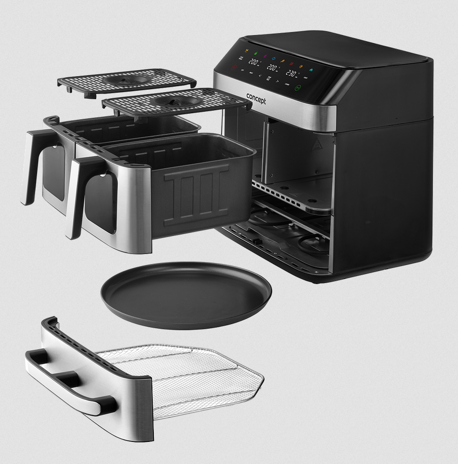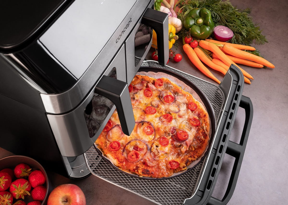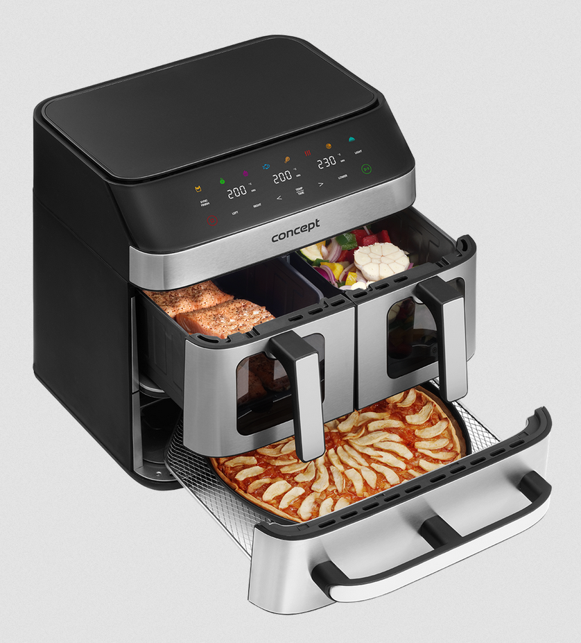 Z frytkownicą beztłuszczową 18,5 l PIZZA TRIO Concept FR9000 z dwoma niezależnymi koszami i multifunkcyjną szufladą do pieczenia przygotujesz kompletne menu za jednym razem. Podczas gdy w koszach frytkownicy przygotujesz danie główne i dodatek, w multifunkcyjnej szufladzie upieczesz ciasto do popołudniowej kawy. To jest gotowanie nowej generacji – szybkie, smaczne, efektywne i bez kompromisów
