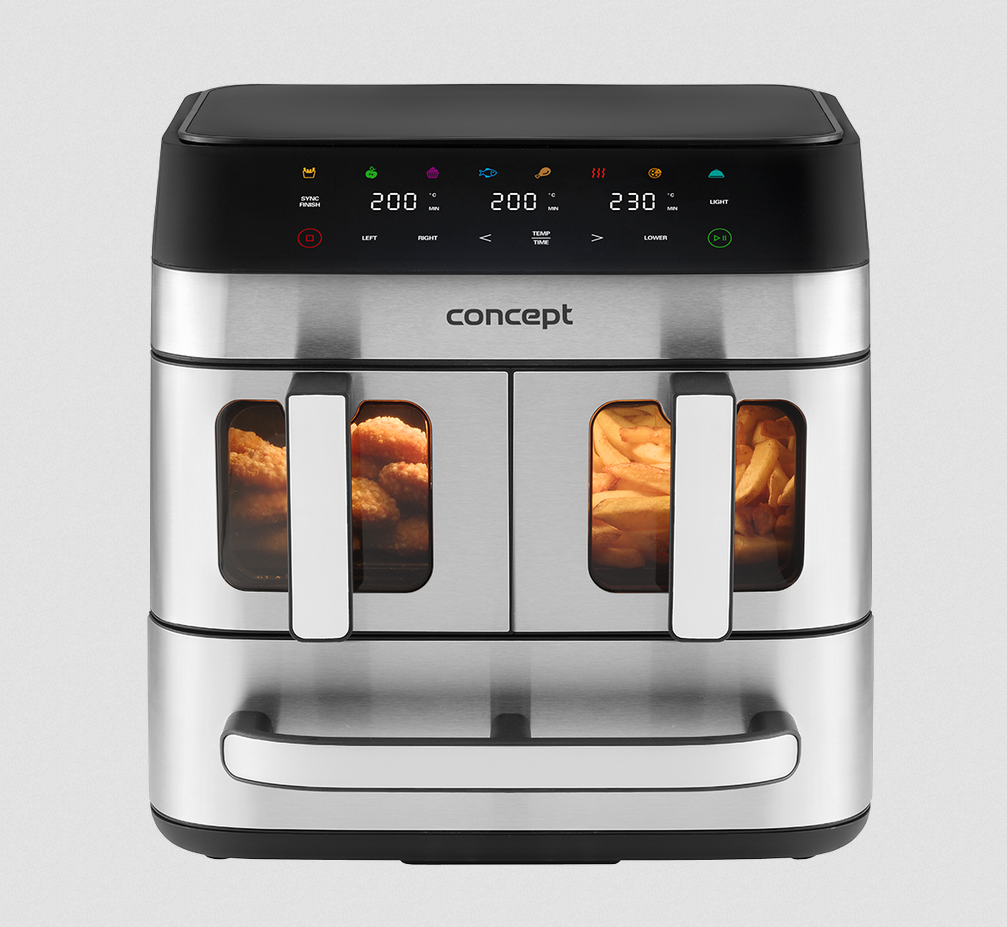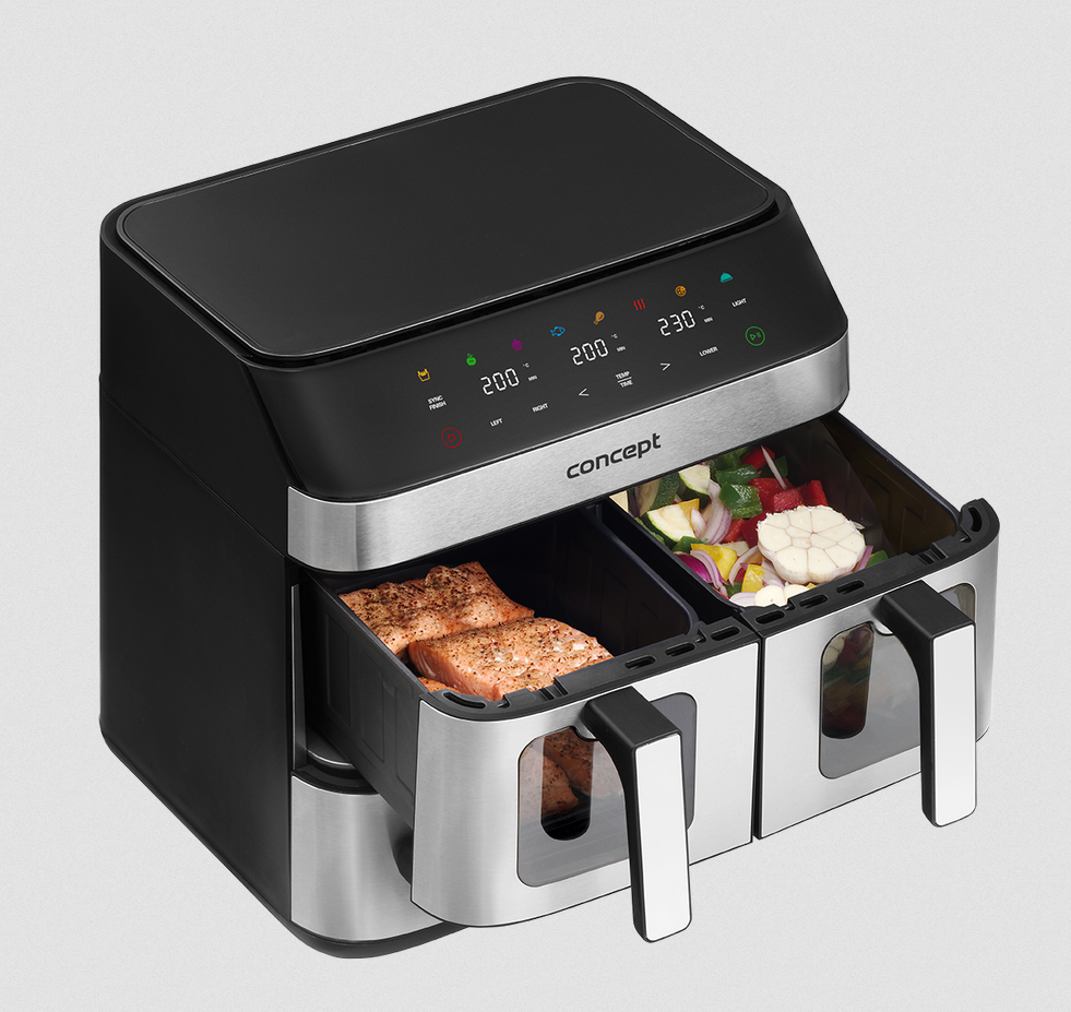 Dwa oddzielne kosze frytkownicy o pojemności 4,25 litra umożliwiają jednoczesne przygotowanie dwóch różnych potraw – na przykład frytek i kurczaka – bez wzajemnego przenoszenia smaków. Dzięki funkcji synchronizacji pieczenia również potrawy o różnym czasie przygotowania kończą się w tym samym momencie. Rezultatem jest oszczędność czasu, większy komfort i pewność, że całe menu będzie podane w optymalnej temperaturze. Kosze można używać niezależnie lub w połączeniu z multifunkcyjną szufladą do pieczenia.