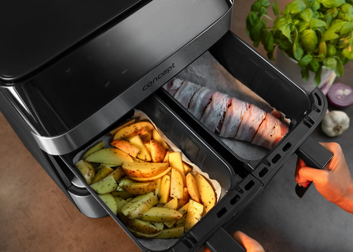 Dzięki dwóm koszom i multifunkcyjnej szufladzie przygotujesz mięso, dodatki i deser jednocześnie. To oszczędność czasu i energii, a jednocześnie gwarancja różnorodnych, świeżych posiłków dla całej rodziny.