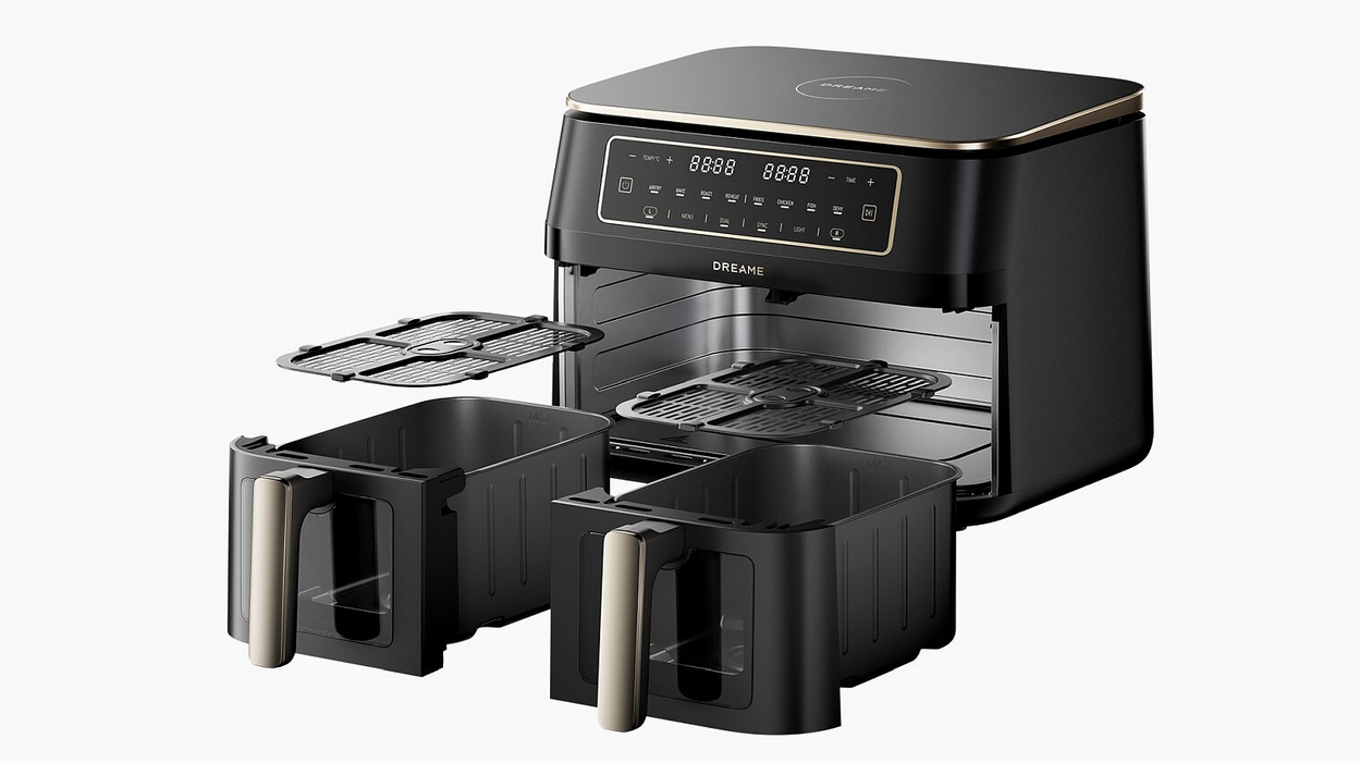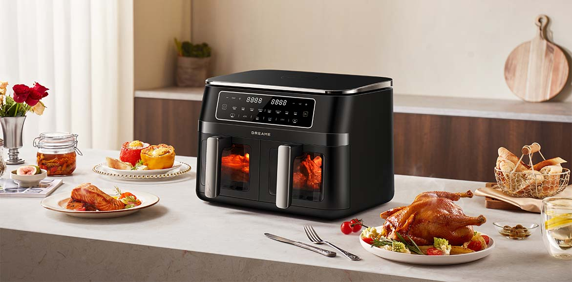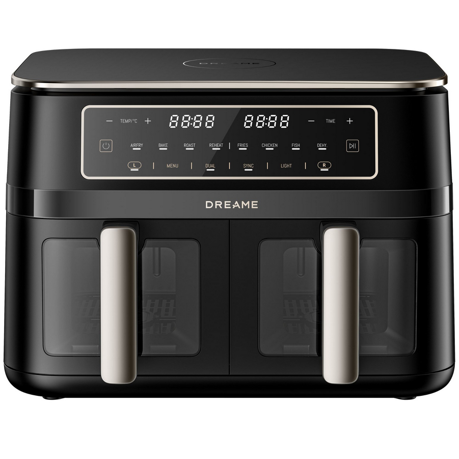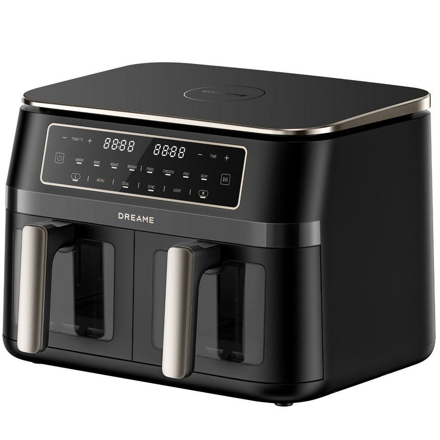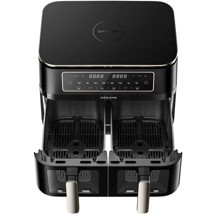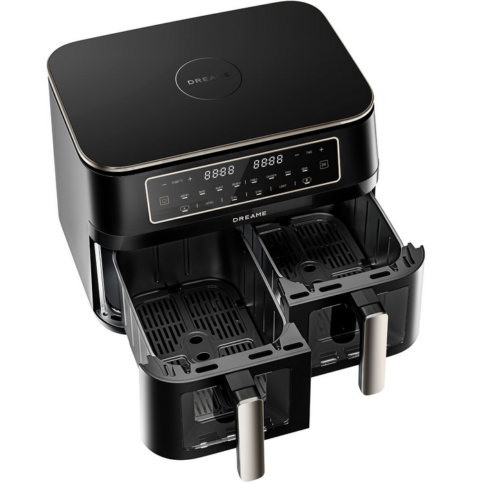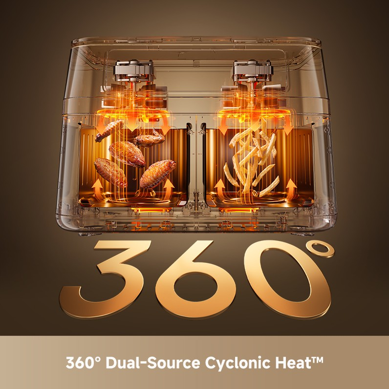 360° Dual-Source Cyclonic Heat™ zapewnia chrupkość w szybkim czasie bez obracania. Para o wysokiej temperaturze umożliwia zatrzymywanie wilgoci oraz zapewnia kruchość - chrupiące na zewnątrz, kruche w środku. Powłoka tytanowo-ceramiczna umożliwia łatwe czyszczenie, brak zapachów podczas gotowania w wysokich temperaturach. Duża pojemność 11 litrów z dwoma niezależnymi naczyniami do gotowania, Pojemność pojedynczego garnka wynosi 5,5 l, umożliwia jednoczesne gotowanie 2 różnych potraw, spełniając jednorazowo różnorodne gusty i potrzeby ilościowe całej rodziny. 8 inteligentnych programów umożliwiających uzyskanie pysznych rezultatów za jednym dotknięciem. Technologia szerokozakresowego odwadniania w niskiej temperaturze, łatwo przygotujesz suszone owoce w domu.