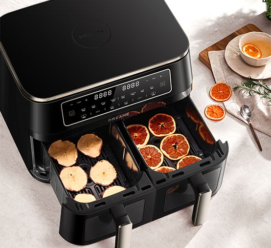 Air fryer Dreame Tasti™ DZ30 wyposażony został w 8 zaprogramowanych trybów pracy, które obejmują między innymi funkcję suszenia owoców. Dzięki precyzyjnemu monitorowaniu wilgotności, urządzenie potrafi usunąć ponad 80% zawartości wody w ciągu około 3 godzin, oferując szybki i wygodny sposób na przygotowanie zdrowych przekąsek. Różnorodność trybów umożliwia przygotowanie szerokiego wachlarza dań – od mięs, przez warzywa, aż po desery.