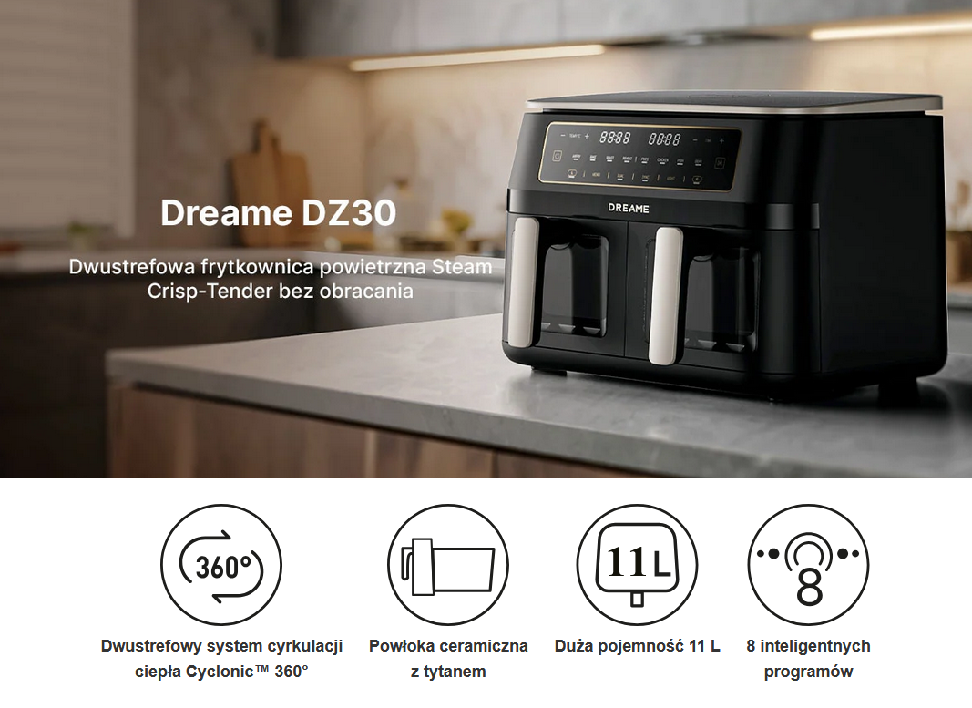 Model DZ30 wyposażony został w dwa niezależne kosze, a każdy z nich oferuje pojemność 5,5 litra. To rozwiązanie pozwala przygotować dwa różne dania jednocześnie – bez ryzyka przenikania smaków czy zapachów. Funkcja ta sprawdzi się szczególnie dobrze w domach, gdzie potrzeby kulinarne domowników są zróżnicowane. Dzięki niej możesz szybko i wygodnie serwować pełnowartościowy posiłek, nie czekając na zakończenie pierwszego etapu gotowania.