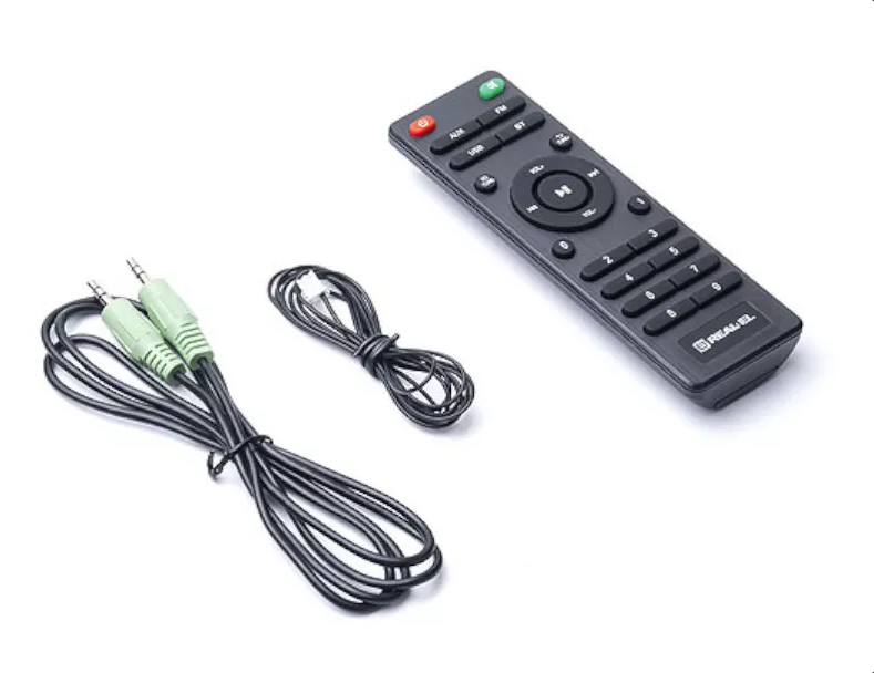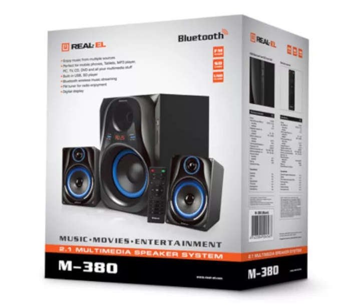 REAL-EL M-380 wyposażony został w subwoofer o średnicy 127mm i satelity o średnicy 76mm. Głośniki można podłączyć do prawie każdego źródła sygnału audio, w tym przez Bluetooth. Bezprzewodowy pilot dołączony do zestawu umożliwia wybór źródła dźwięku oraz regulację poziomu głośności lub całkowite wyłączenie dźwięku. Urządzenie jest również wyposażone w odtwarzacz plików audio z USB oraz kart SD, wejście AUX oraz radio FM.