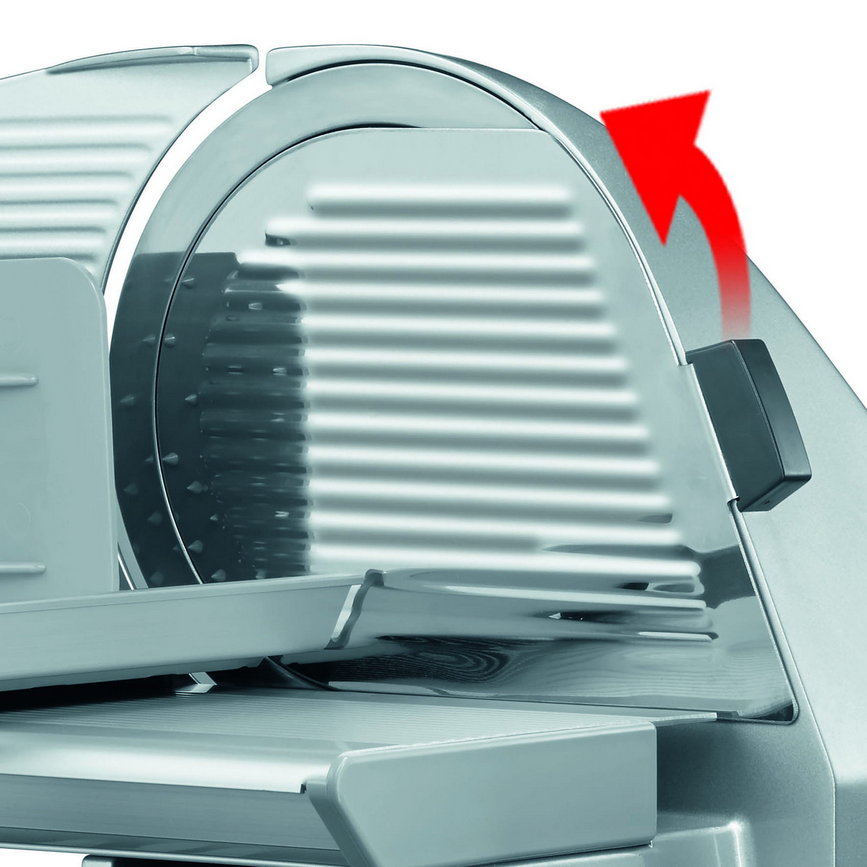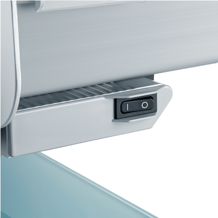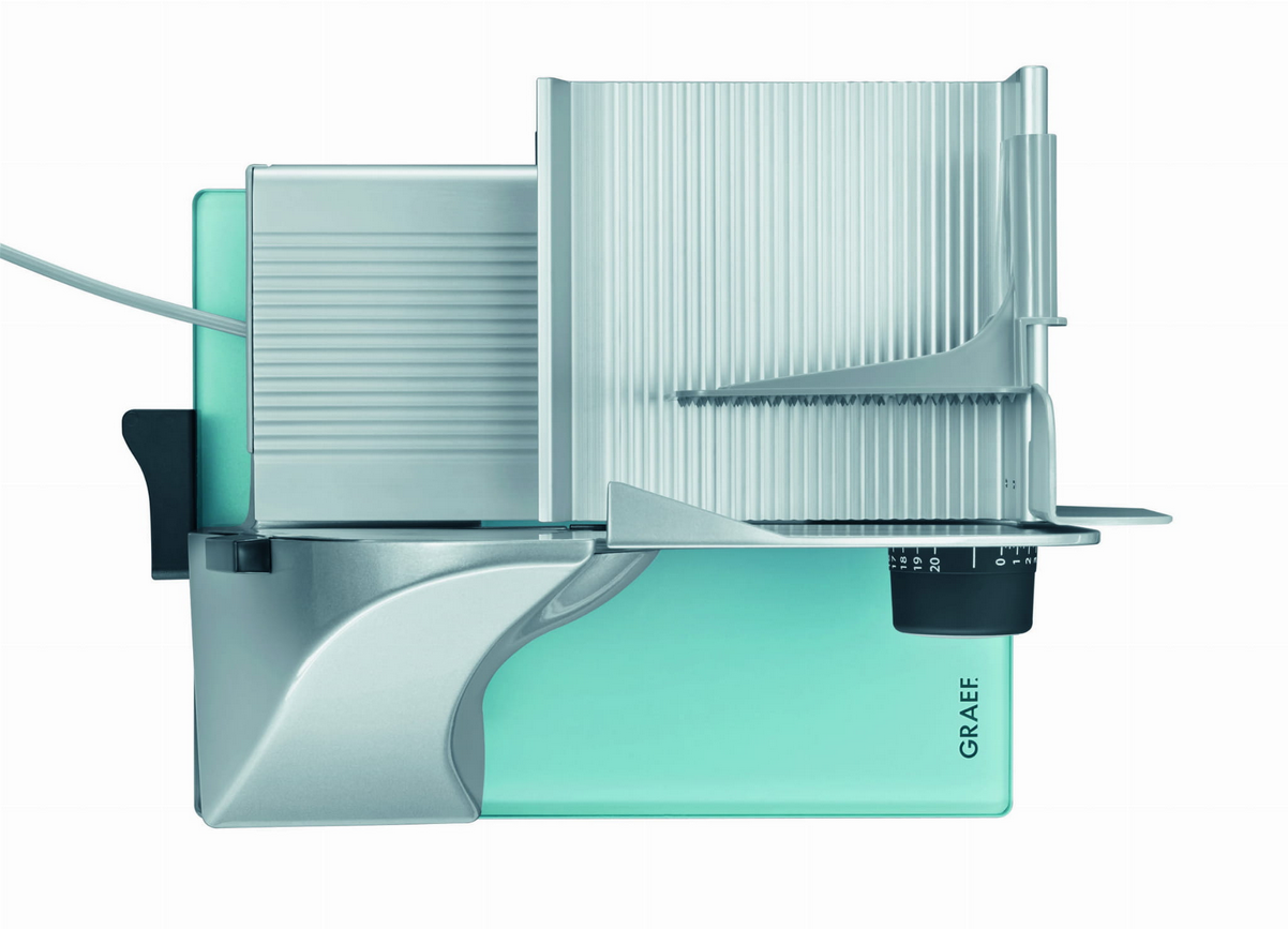 Graef Master M80 został wyposażony w szybki włącznik do włączania maszyny i cięcia jedną ręką. Maszyna działa tylko wtedy, gdy naciśniesz ten przycisk kciukiem. Dzięki bezstopniowej regulacji grubości krojenia w zakresie od 0 do 20 mm można uzyskać zarówno „rustykalne”, jak i cienkie jak brzytwa rezultaty krojenia.