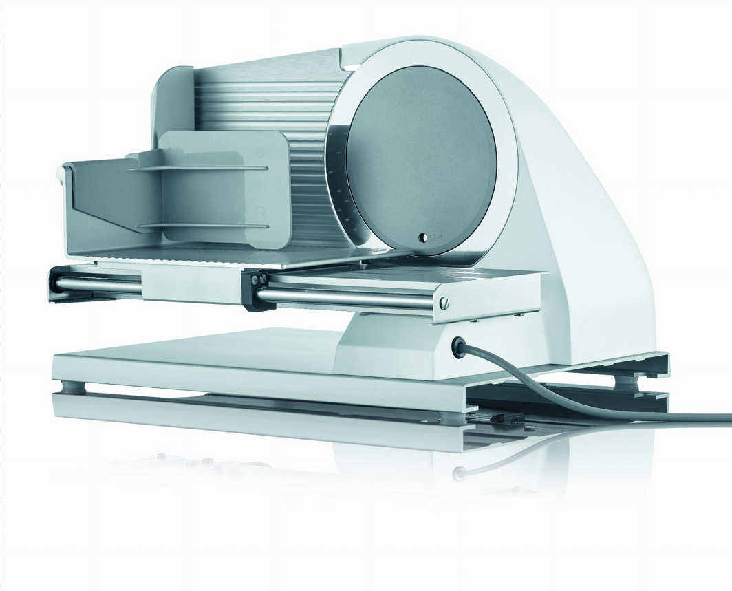 Warto wspomnieć, że dla komfortu użytkownika, sanie zostały wykonane z twardego anodyzowanego aluminium z profesjonalną okrągłą prowadnicą. Dzięki temu komfort z używania krajalnicy jest jeszcze większy, tak samo jak stabilność i łatwość jej obsługi. Aluminiowa podstawa z otworem na deskę do krojenia poprawia komfort użytkowania.