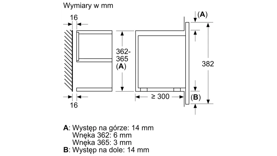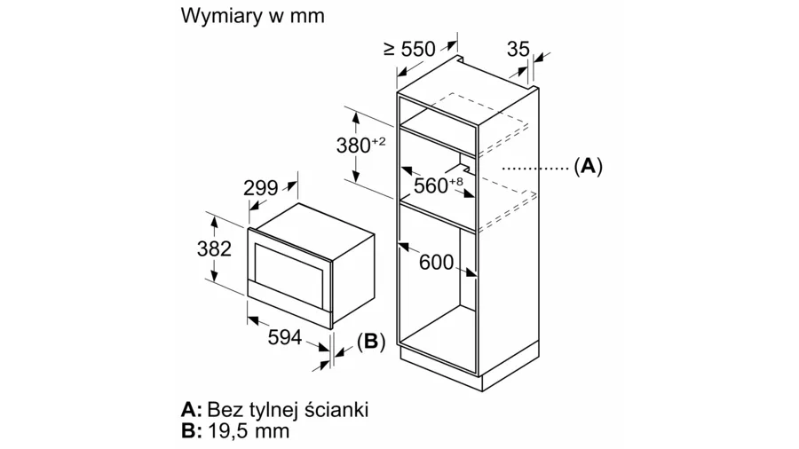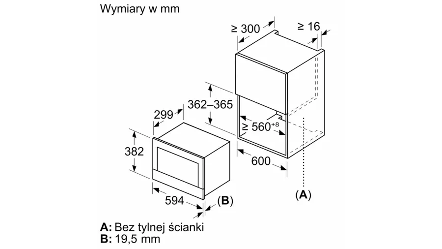 Wymiary niszy (WxSxG): 362 mm - 382 mm x 560 mm - 568 mm x 300 mm