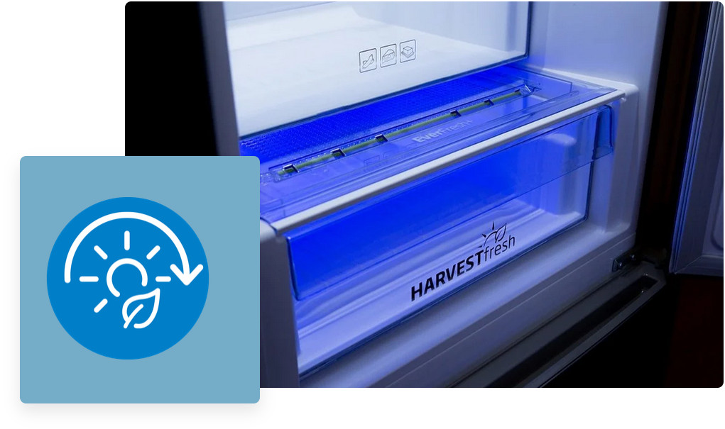Jest to innowacyjna technologia 3 kolorów, dzięki której możemy na dłużej zachować witaminy A i C w przechowywanych warzywach i owocach. Dzięki temu nasze produkty zachowają świeżość na dłużej. W dedykowanej szufladzie HarvestFresh imitowany jest 24-godzinny cykl słońca za pomocą światła w kolorach niebieskim, zielonym i czerwonym.