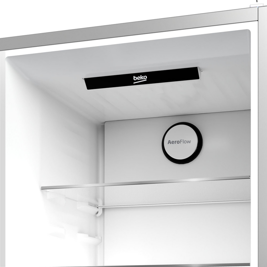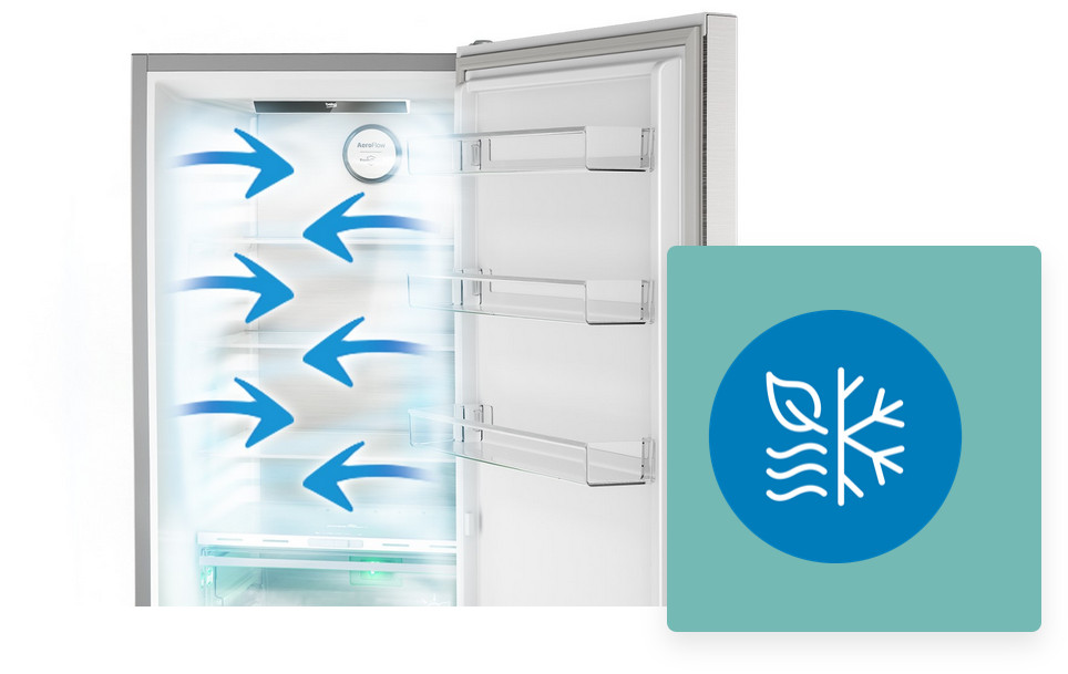 Innowacyjny system chłodzenia typu No Frost - Beko AeroFlow™. Zimne powietrze równomiernie otacza żywność na wszystkich półkach w lodowce, aby na dłużej zachować ich świeżość i soczystość. Dzięki delikatnej dystrybucji powietrza i zminimalizowaniu wahań temperatury, technologia AeroFlow™ w jeszcze łagodniejszy sposób dba o żywność w lodówce.