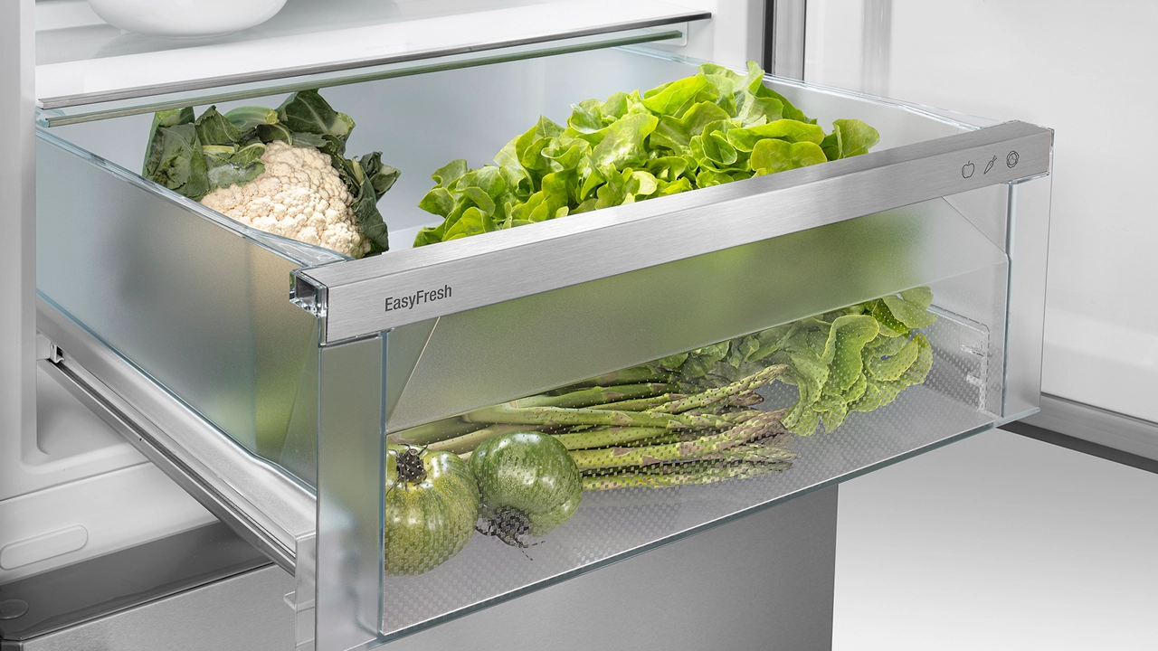 Dzięki zintegrowanym prowadnicom ze stoperem szuflady EasyFresh można otwierać i zamykać bez najmniejszego wysiłku. Druga zaleta pod względem komfortu: szyny umożliwiają niezawodne i mocne zamknięcie komór Safe. Dzięki temu można przechowywać schłodzone artykuły spożywcze zawsze w optymalnych warunkach.