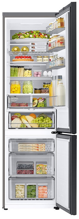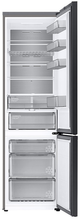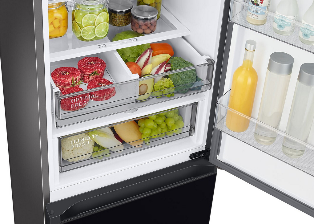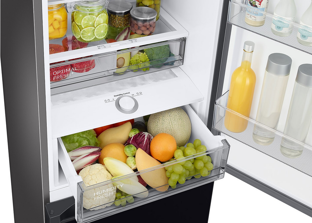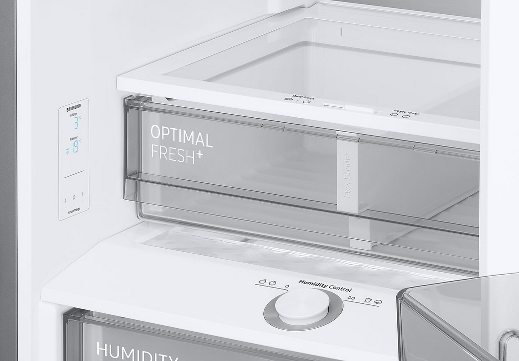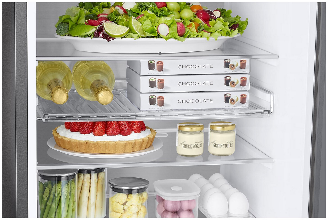 Technologia pełnego No Frost marki Samsung zapewnia stały obieg chłodnego powietrza, systematycznie usuwając nadmiar wilgoci z wnętrza lodówki. Dzięki temu lód i szron nie osadzają się na ściankach czy produktach. Żywność zachowuje świeżość i wartości odżywcze na dłużej, a utrzymanie czystości jest łatwiejsze – bez rozmrażania.