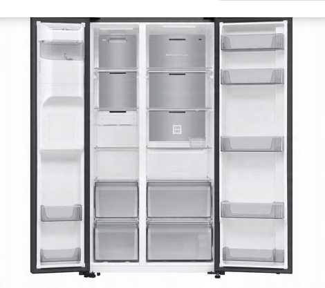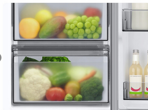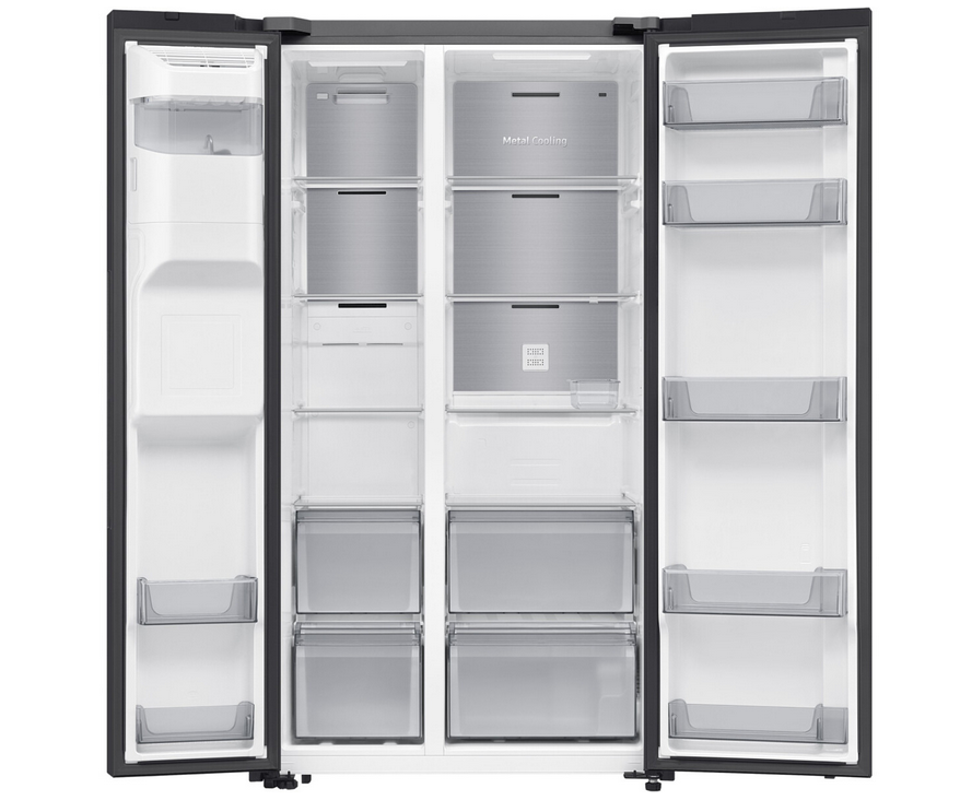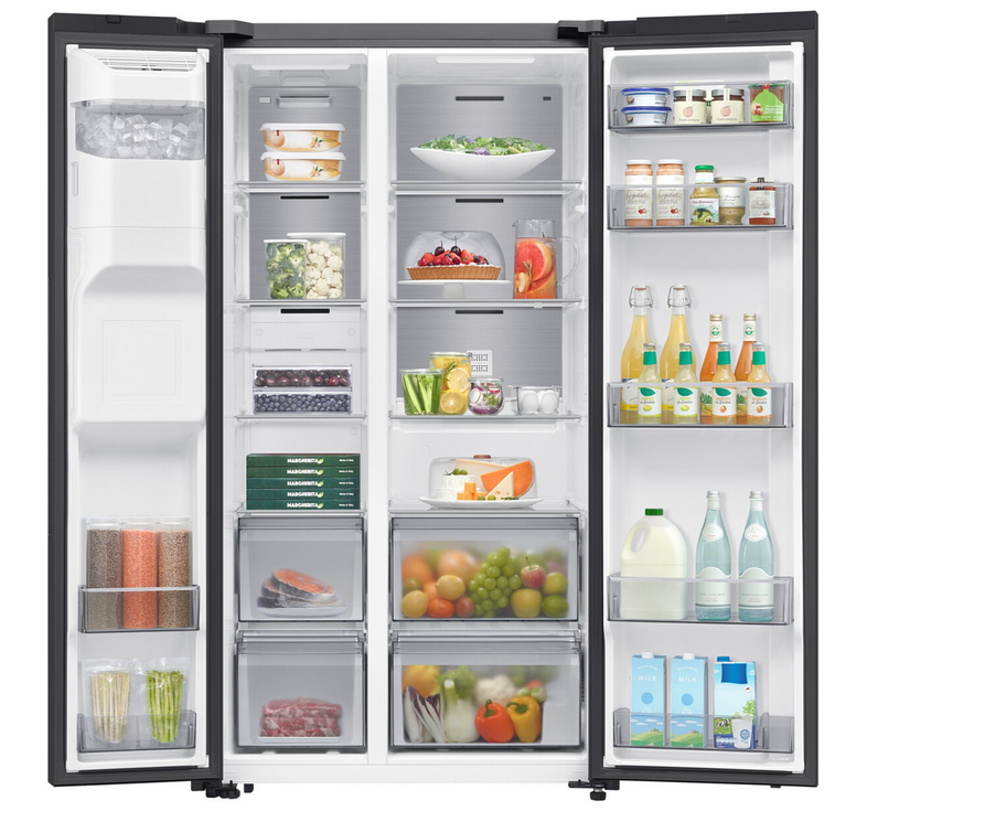 Model RS70F64KEBEO Samsung oferuje dwie przestronne szuflady, idealne na zapas świeżych warzyw i owoców. Taka organizacja wnętrza pozwala szybko znaleźć ulubione produkty i utrzymać porządek bez zajmowania dodatkowej przestrzeni na blatach.