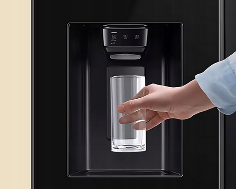Ciesz się przefiltrowaną, schłodzoną wodą lub lodem bez konieczności ręcznego napełniania pojemnika na wodę. Lodówka posiada dystrybutor wody i lodu, który można łatwo podłączyć do instalacji hydraulicznej. Dzięki temu za jednym dotknięciem możesz otrzymać szklankę schłodzonej wody lub kostki lodu.