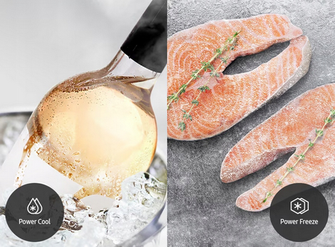 Ciesz się szybkim chłodzeniem. Po naciśnięciu przycisku funkcja Power Cool wdmuchuje strumień bardzo zimnego powietrza do lodówki, aby szybko schłodzić artykuły spożywcze lub ulubione napoje. Funkcja Power Freeze zapewnia intensywny nadmuch zimnego powietrza do zamrażarki, co świetnie sprawdza się podczas głębokiego zamrażania produktów i wytwarzania lodu.