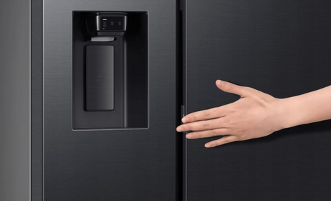 Otwieraj lodówkę bez wysiłku! Funkcja automatycznego otwierania drzwi wykorzystuje czujniki umieszczone po obu stronach, które umożliwiają Ci otwarcie drzwi* za pomocą delikatnego dotknięcia. Podświetlenie czujników jest zawsze włączone, co ułatwia ich znalezienie nawet w ciemności, a wydawany przez nie dźwięk ostrzega, gdy drzwi się otwierają. Umożliwia to wygodny dostęp do produktów i ułatwia ich wyjmowanie. Dodatkowo, dzięki braku wystających uchwytów, lodówka ma stylowy i jednolity wygląd.
