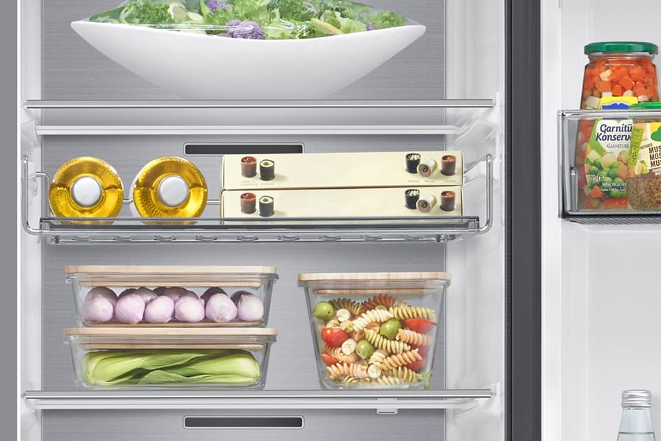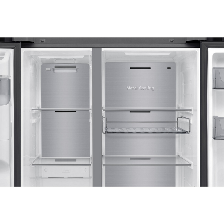 Technologia ta utrzymuje optymalną temperaturę wewnątrz lodówki, dzięki czemu żywność pozostaje świeża, nawet przy częstym otwieraniu i zamykaniu drzwi. Panel Metal Cooling na tylnej ścianie zatrzymuje zimno wewnątrz i pomaga przywrócić niską temperaturę. Dodatkowo nadaje lodówce elegancki wygląd i jest łatwy w czyszczeniu.