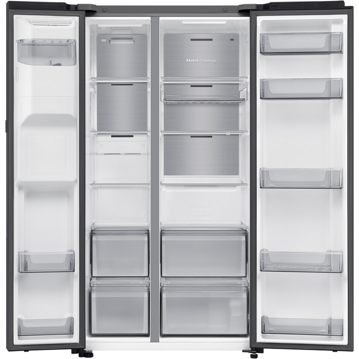 W lodówce Samsung RS80F64KEFEO zastosowano technologię SpaceMax™, która zapewnia więcej miejsca na przechowywanie bez powiększania bryły urządzenia. Cieńsze ścianki, oparte na wydajnym systemie izolacji, maksymalizują przestrzeń wewnątrz chłodziarki.