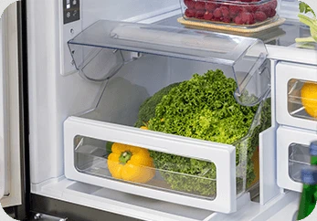 Samo chłodne powietrze nie wystarczy, aby zachować świeżość. Właśnie dlatego Sharp oferuje system utrzymywania odpowiedniej temperatury i wilgoci wewnątrz chłodziarko‑zamrażarek. Tylny aluminiowy panel wewnątrz lodówki jest chłodzony do około 0°C, a wilgotne, schłodzone powietrze jest rozprowadzane wewnątrz komory, w celu utrzymywania świeżości produktów. Zapobiega to nadmiernemu osuszeniu, nierównomiernemu chłodzeniu i przechłodzeniu. Schłodzone powietrze jest doprowadzane od tyłu, zapewniając chłodzenie pośrednie, wspomagające utrzymanie świeżości produktów. Wentylatorowy system chłodzenia od góry zmniejsza możliwość uszkodzenia produktów żywnościowych.