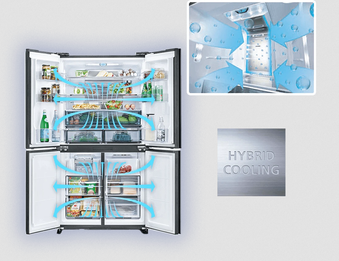 System Hybrid Cooling Sprawdzone rozwiązanie redukujące pobór energii elektrycznej J-Tech Inwerter. Nowe spojrzenia na funkcje sterowania kompresora z inwerterem Inteligentne sterowanie obrotami podwójnych wentylatorów pod kontrolą kompresora z inwerterem. Kompresor J-Tech Inverter wyróżnia się 36 stopniami regulacji prędkości obrotów. Oznacza to, że wzrosty lub spadki temperatur nie są duże i nagłe, więc kompresor zużywa mniej prądu do utrzymania zadanej temperatury a także potrzebuje mniej energii, by wrócić do zadanej temperatury po otwarciu drzwi lodówki. Dodatkowo J-Tech Inverter przy zamkniętych drzwiach urządzenia utrzymuje niską, stałą prędkość obrotową podwójnego wentylatora na poziomie 1200 obr./min. Po otwarciu drzwi chłodziarki, urządzenie przełącza się na wysokie obroty 4250 obr./min., by szybko przywrócić zadaną temperaturę, następnie powraca do najniższej wartości obrotowej. W efekcie lodówki technologią J-Tech Inverter są jednymi z najcichszych na rynku, osiągając poziom 38 dB(A), i mogą stać w otwartych kuchniach połączonych z pokojem dziennym, nie zakłócając spokoju domowników