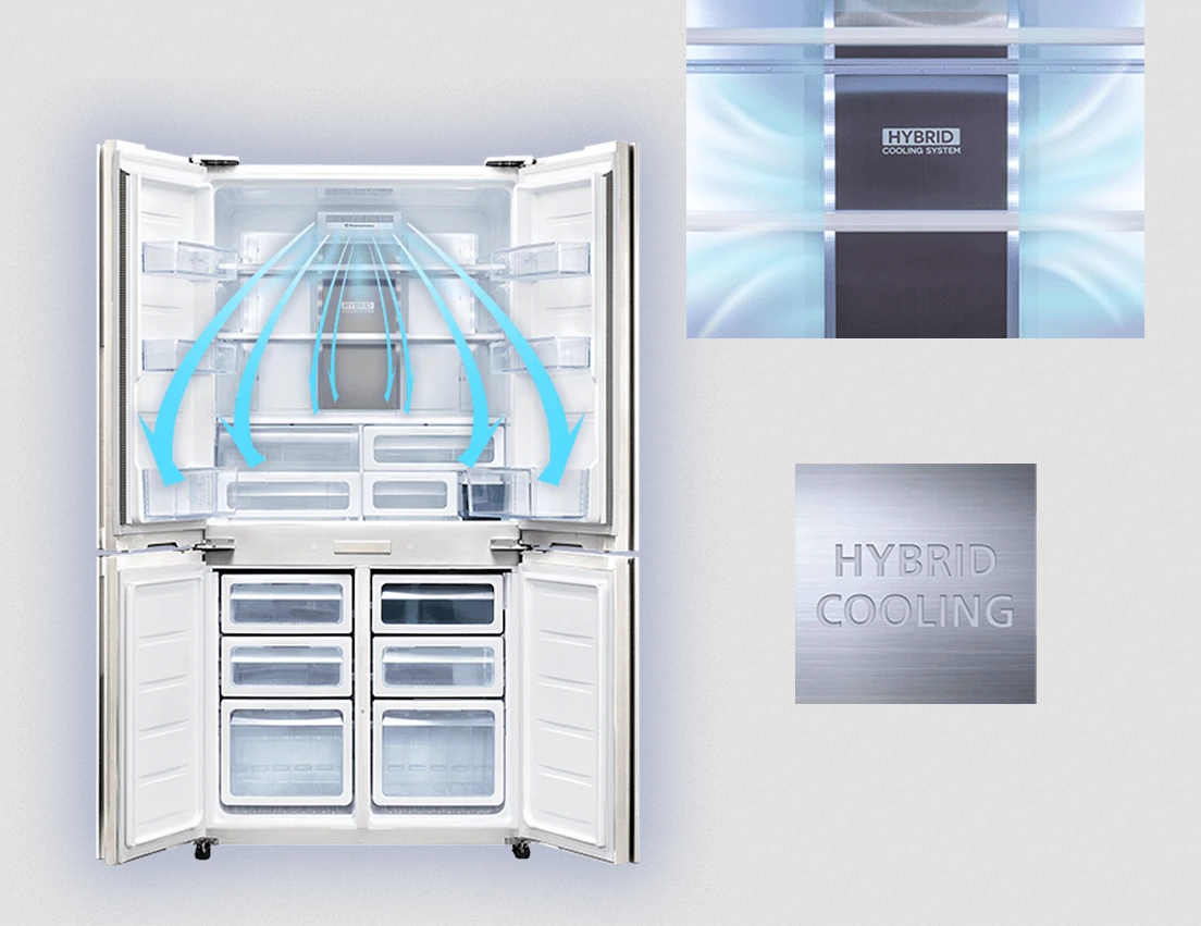 Samo chłodne powietrze nie wystarczy, aby zachować świeżość. Właśnie dlatego Sharp oferuje system utrzymywania odpowiedniej temperatury i wilgoci wewnątrz chłodziarko‑zamrażarek. Tylny aluminiowy panel wewnątrz lodówki jest chłodzony do około 0°C, a wilgotne, schłodzone powietrze jest rozprowadzane wewnątrz komory, w celu utrzymywania świeżości produktów. Zapobiega to nadmiernemu osuszeniu, nierównomiernemu chłodzeniu i przechłodzeniu. Schłodzone powietrze jest doprowadzane od tyłu, zapewniając chłodzenie pośrednie, wspomagające utrzymanie świeżości produktów. Wentylatorowy system chłodzenia od góry zmniejsza możliwość uszkodzenia produktów żywnościowych.