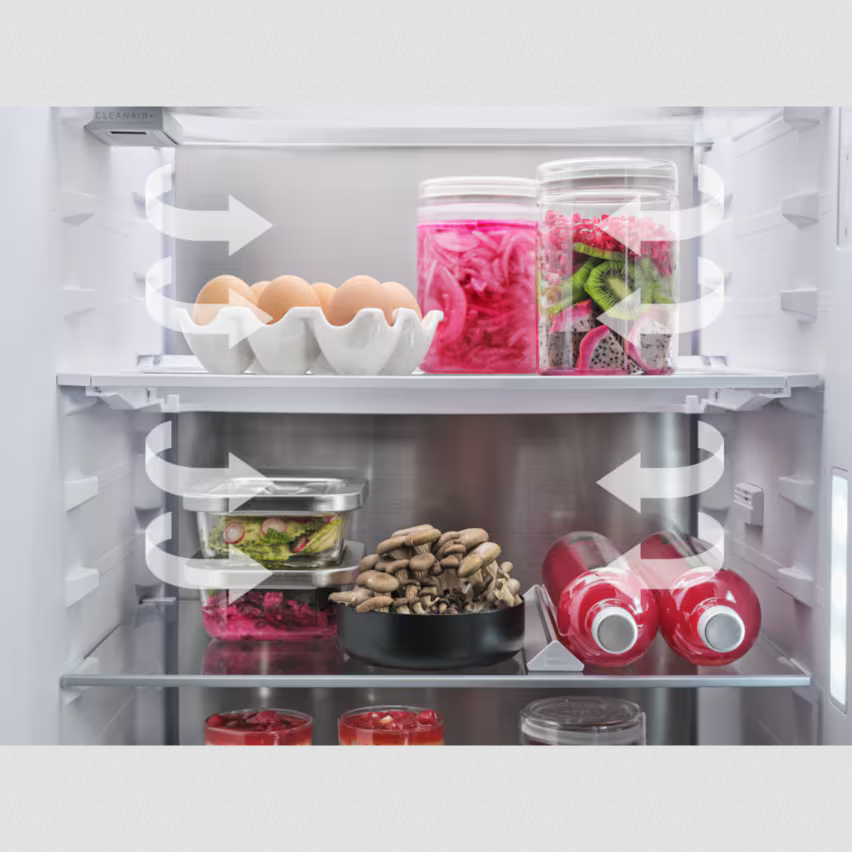 Ochrona jakości żywności dzięki stabilnej temperaturze i wilgotności w całej lodówce. Wnętrze ze stali szlachetnej tworzy designerski efekt. Wydajne kanały wentylacyjne szybko przywracają niską temperaturę po każdym otwarciu drzwi lodówki, ograniczając marnowanie żywności nawet o 28%*.