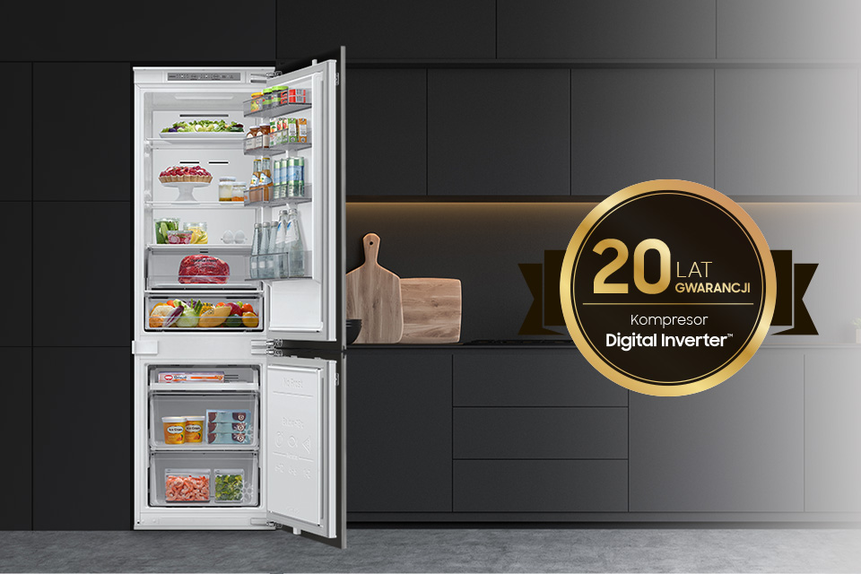 Technologia Digital Inverter automatycznie dostosowuje prędkość kompresora w zależności od zapotrzebowania na chłodzenie i w ten sposób zapewnia wydajniejszą pracę. Dzięki ulepszonej konstrukcji kompresor Digital Inverter zużywa mniej energii, zwłaszcza podczas utrzymywania stałej temperatury. Samsung oferuje również 20-letnią gwarancję na kompresor⁴.