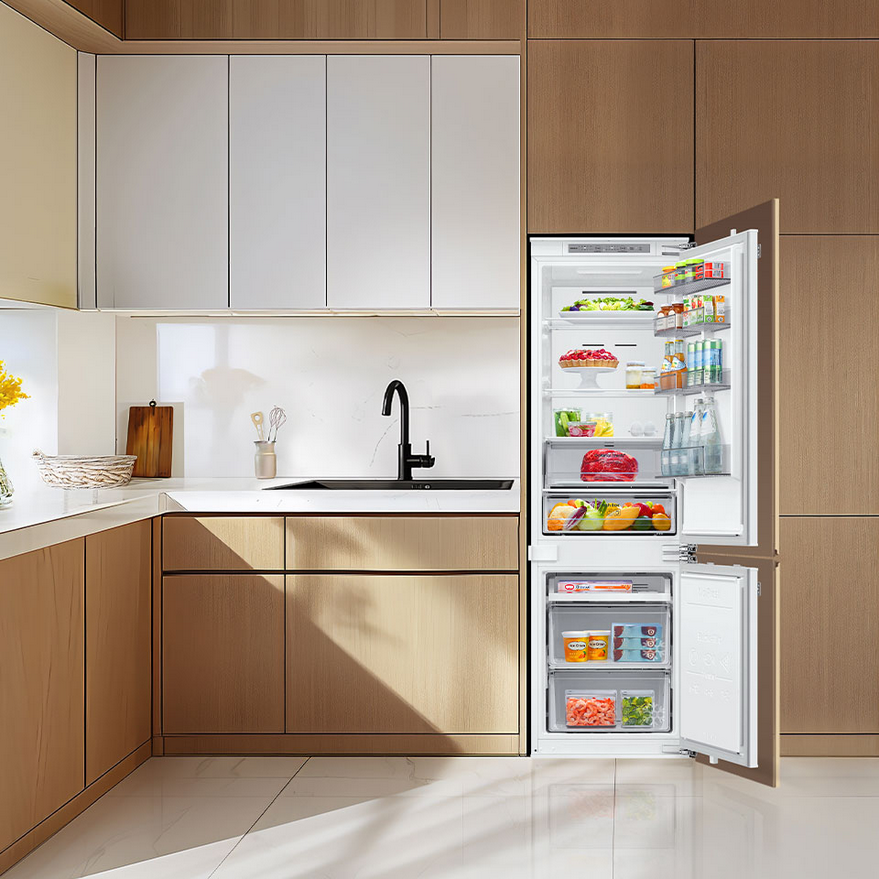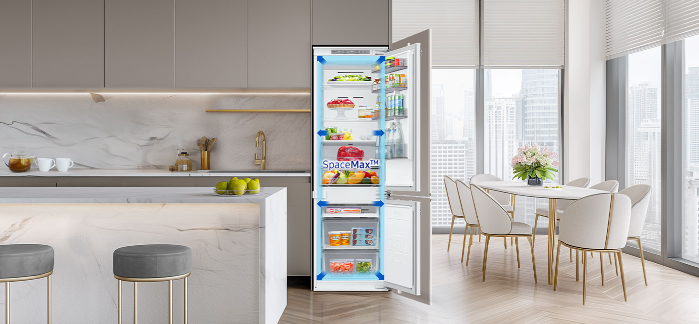 Przechowuj więcej jedzenia w lodówce o pojemności 267 litrów w standardowej konstrukcji o głębokości 550 mm, która idealnie dopasuje się do szafek. Wysokowydajna izolacja technologii SpaceMax™ sprawia, że ściany są znacznie cieńsze. Dzięki temu powstaje więcej miejsca do przechowywania