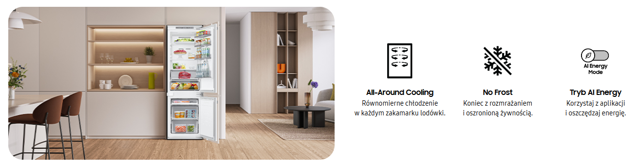 - Dodatkowe informacje: Tryb Smart Things AI Energy, All-Around Cooling, Optimal Fresh+, SmartThings, Tryb wakacyjny, Zawiasy nożycowe, Wbudowane WiFi, No Frost, Technologia Space Max, Gentle Lighting