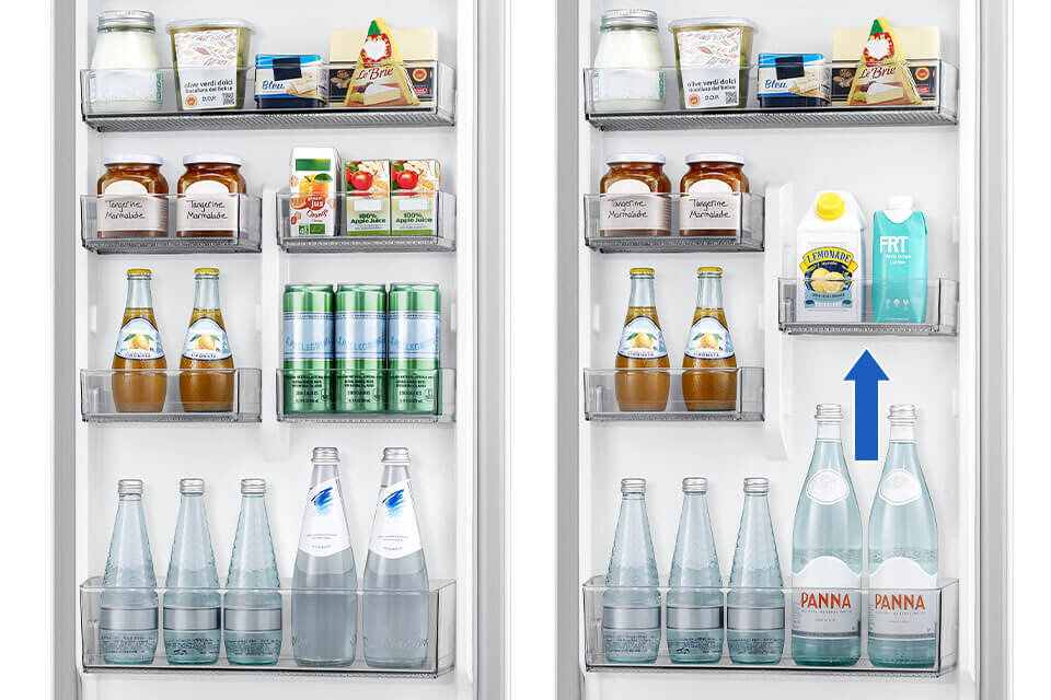 7 praktycznych balkoników, które możesz dowolnie przestawiać, pomieści zarówno słoiki z dżemami, jak i wysokie butelki. Dzięki temu w głównej komorze zyskasz więcej miejsca na produkty.