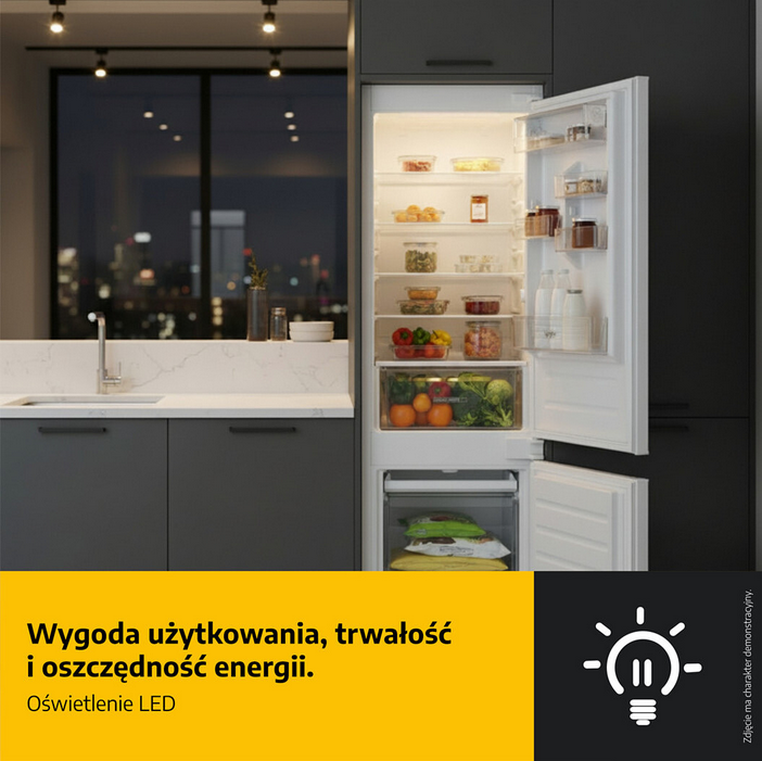 Doskonałe oświetlenie.Energooszczędne diody LED rozprowadzają światło równomiernie po komorze lodówki, dzięki czemu łatwiej jest znaleźć to, czego się szuka.