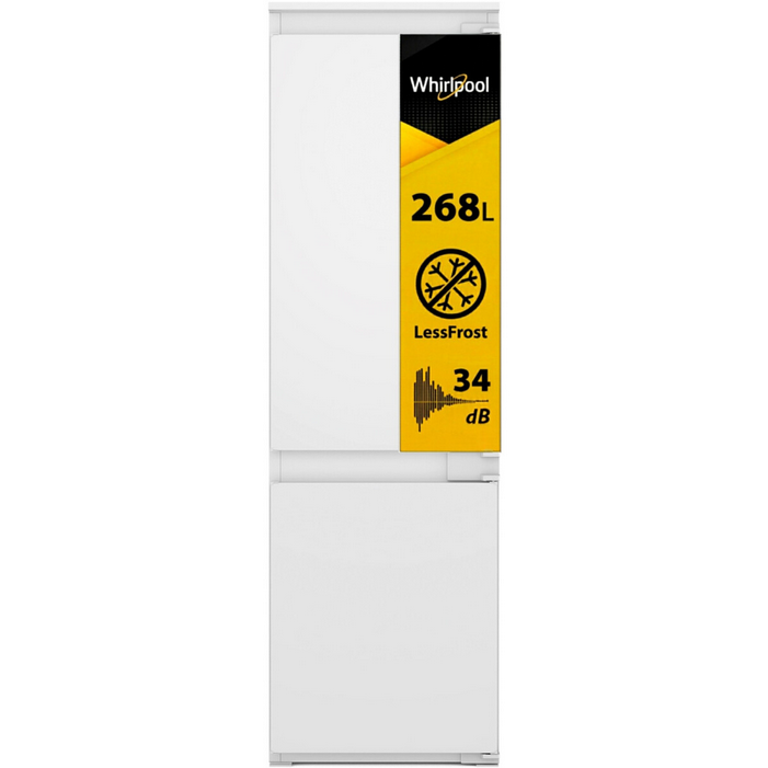 Cechy lodówko-zamrażarki do zabudowy Whirlpool: kolor biały. Szklane półki zapewniają wytrzymałość i elegancję. Czujniki 6-ty Zmysł automatycznie obniżają temperaturę w lodówce po włożeniu nowych produktów, zmniejszając zużycie energii. Praktyczna półka do bezpiecznego przechowywania butelek.
