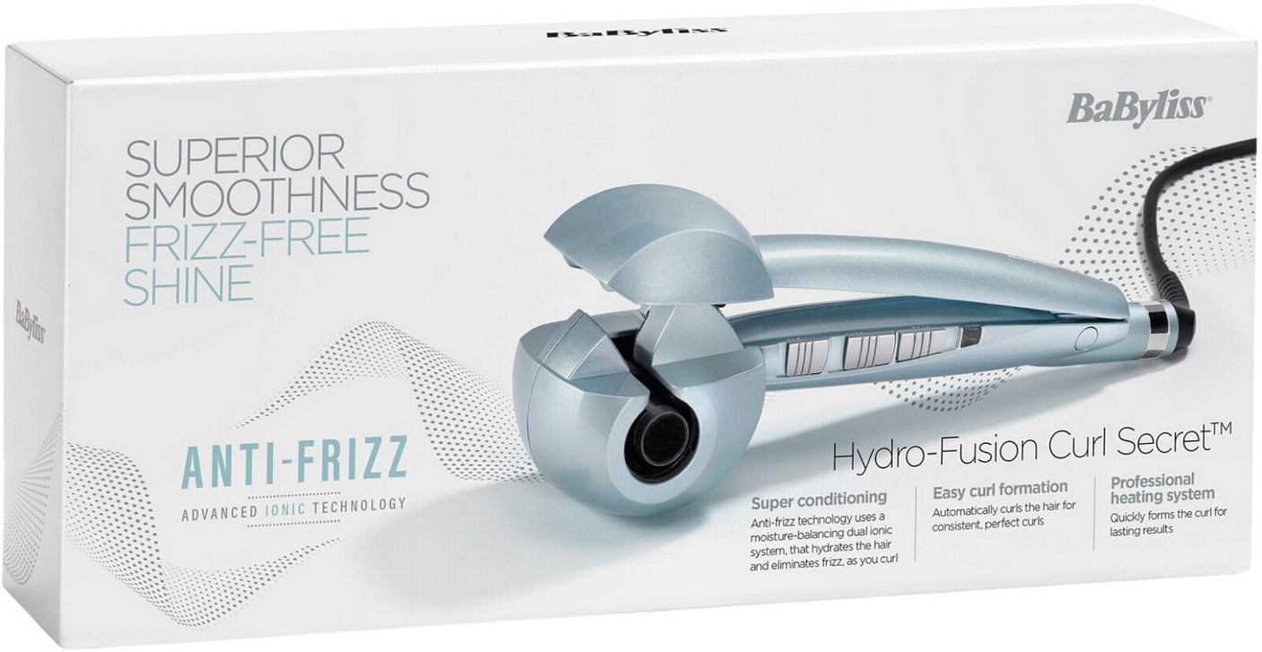 Lokówka automatyczna BaByliss Hydro-Fusion Curl Secret. Posiada 3 ustawienia czasu kręcenia loków , 3 ustawienia skrętu loków i 3 ustawienia temperatury. Technologia Hydro-Fusion obejmuje zaawansowany, równoważący wilgoć podwójny system jonizacji, który łączy w sobie zarówno jony dodatnie, jak i ujemne, aby wyeliminować puszenie się włosów podczas kręcenia. Włosy pozostają jedwabiste, odżywione i lśniące.