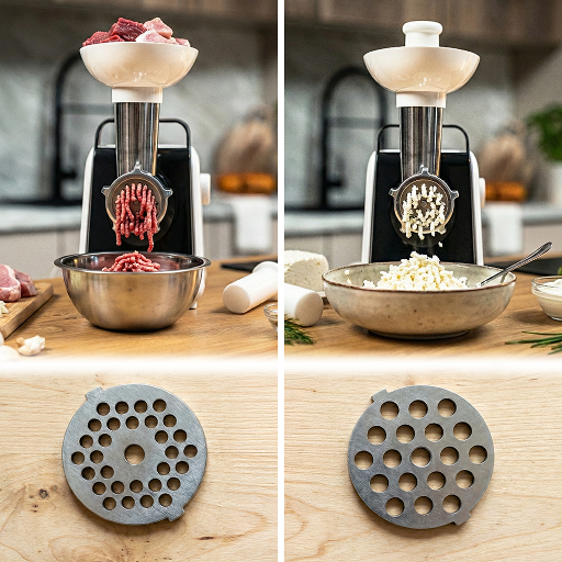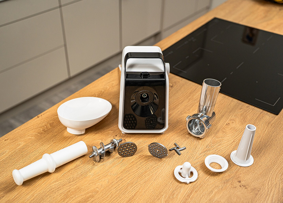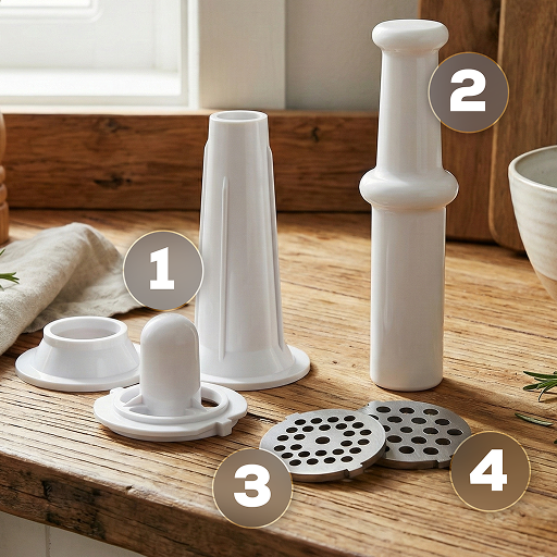 Bogaty zestaw akcesoriów, w tym przystawka do kiełbas (1), popychacz (2) i sitka ze stali nierdzewnej 5 mm(3) i 7 mm (4), pozwala na wszechstronne zastosowanie maszynki do mielenia. To kompleksowe rozwiązanie dla osób, które chcą przygotowywać różne rodzaje potraw z pełną kontrolą nad ich jakością.