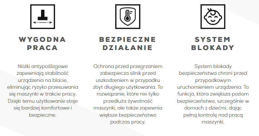 - Zabezpieczenia Nóżki antypoślizgowe, Zabezpieczenie przed przegrzaniem, Blokada bezpieczeństwa