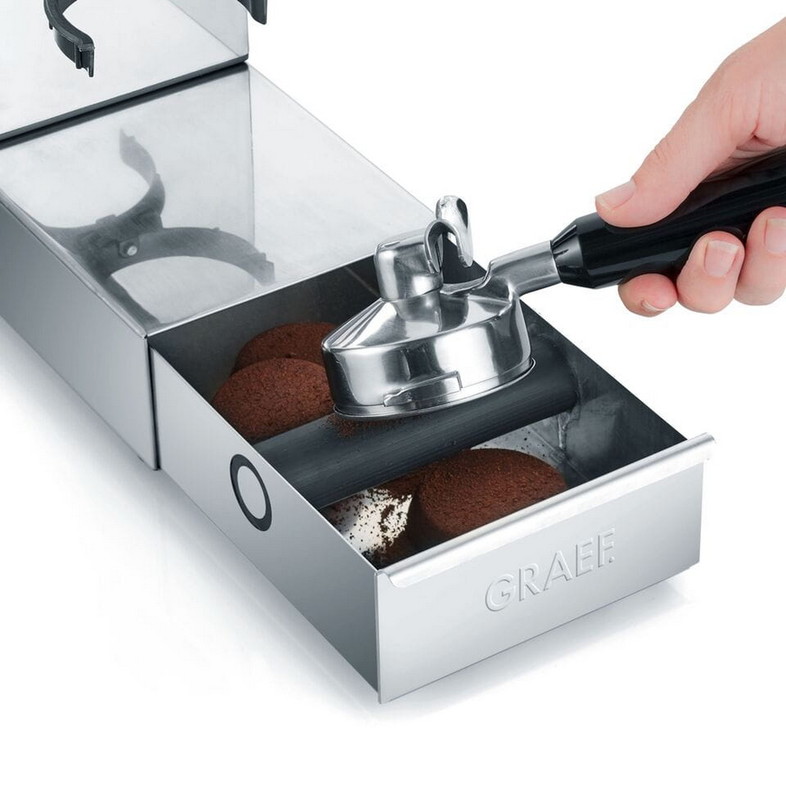 W podstawie młynka CM 850 znajduje się wysuwana szuflada na fusy z gumowym odbijakiem.