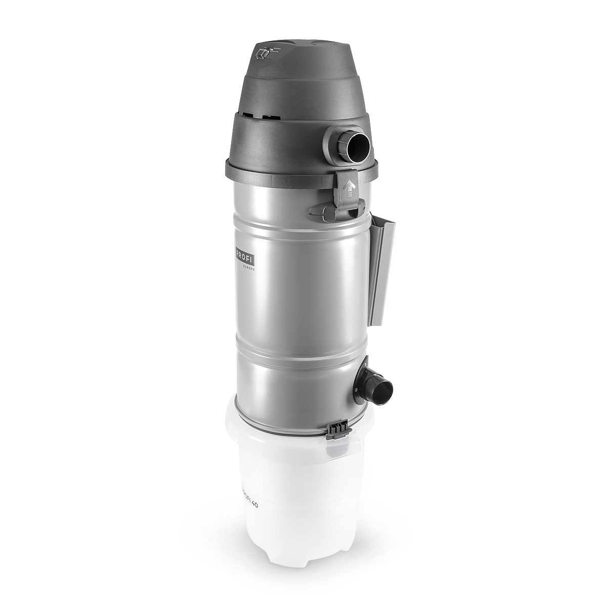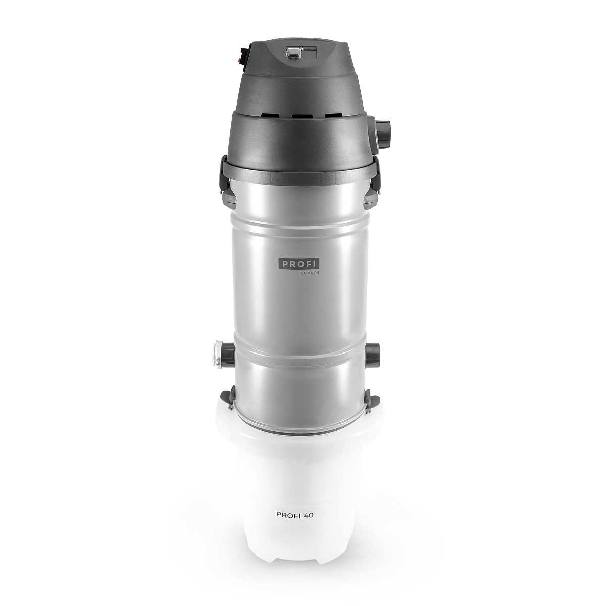 Odkurzacz PROFI 40 wyposażony jest w trzystopniową turbinę Ametek By-Pass o dużej żywotności. Posiada dwa stopnie oczyszczania powietrza. Pierwszy to cyklon, który zatrzymuje duże zanieczyszczenia na dnie zbiornika. Drugim jest filtr samoczyszczący pokryty teflonem. W tym modelu istnieje możliwość zastosowania filtra w postaci worka syntetycznego, który umożliwia bardzo higieniczne opróżnianie zbiornika bez kontaktu ze śmieciami. PROF| P40 przeznaczony jest do domów o maksymalnej długości przewodu magistralnego do 50 m oraz 10 gniazd ssawnych. PROF| P40 posiada uniwersalny system podłączenia instalacji ssącej i wyrzutowej z prawej lub lewej strony.