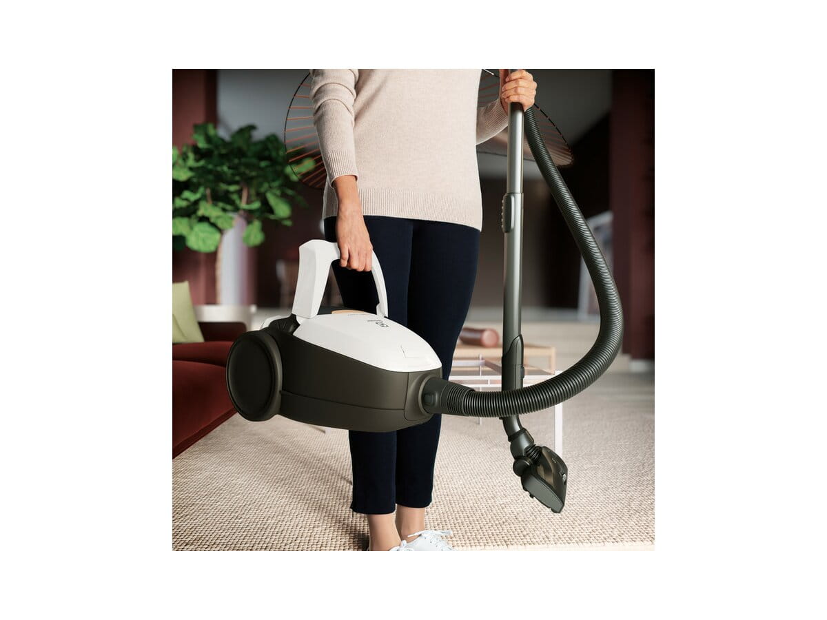 Doskonale wyważony uchwyt daje możliwość wygodnego podnoszenia i przenoszenia odkurzacza. Uchwyt został umieszczony na środku, aby ciężar rozkładał się równomiernie. Smukła konstrukcja sprawia, że odkurzacz jest bardziej zwrotny i łatwo nim manewrować.