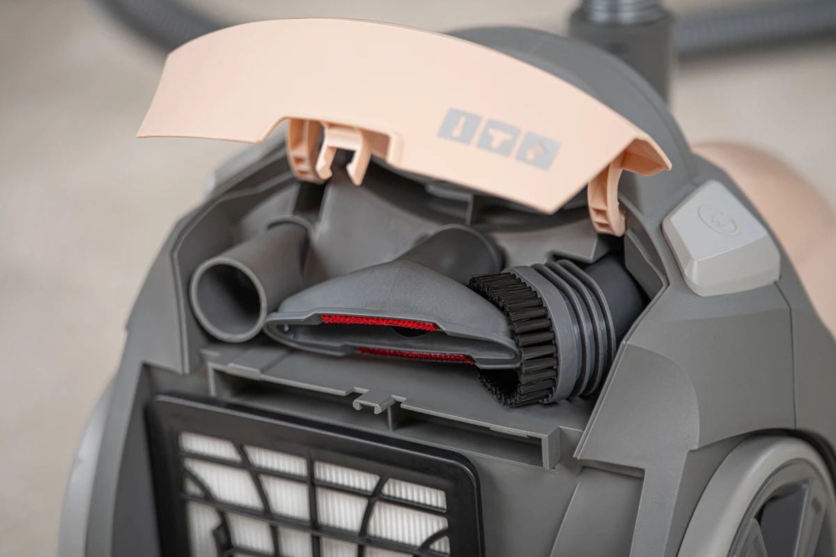Wbudowany schowek na akcesoria eliminuje problem gubienia końcówek i pozwala na wygodne przechowywanie ich w jednym miejscu. Dzięki temu zawsze masz pod ręką potrzebne narzędzie, a sam odkurzacz pozostaje kompaktowy i uporządkowany.