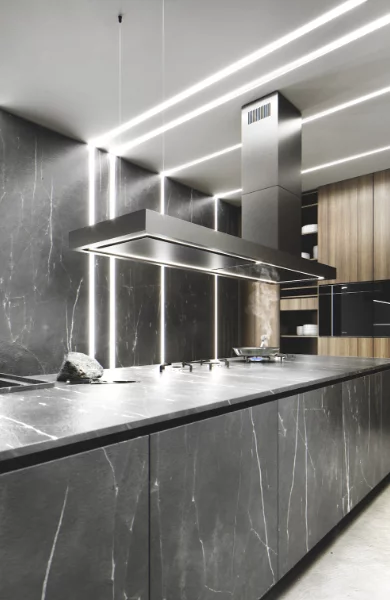 Oświetlenie, które zostało poprowadzone w formie ramy dookoła okapu, przyciąga domowników i Twoich gości. Tworzysz nowe miejsce do rozmów przy porannej kawie, szybkiego lunchu w ciągu dnia, wieczornych spotkań z przyjaciółmi czy przeciągających się do późna domówek. To niepowtarzalna atmosfera, która zachęca do celebracji codzienności!