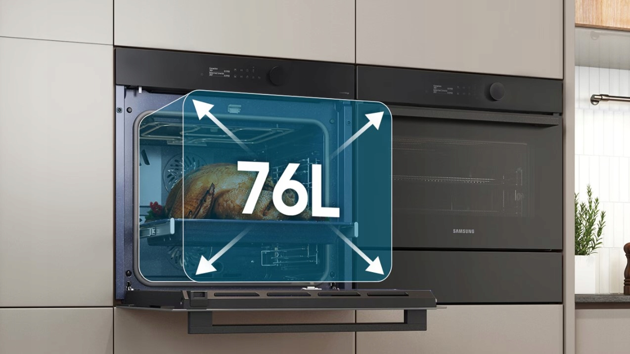 Pojemność aż 76L ułatwia przygotowanie potraw o dużych rozmiarach lub ich większej ilości. Stwarza to nowe możliwości podczas gotowania. Przygotowując przyjęcie, można z łatwością przyrządzić różne rodzaje potraw w jednym czasie. Piekarnik spokojnie pomieści nawet tak duże potrawy, jak sporych rozmiarów indyk, zaplanowany na rodzinne spotkanie.