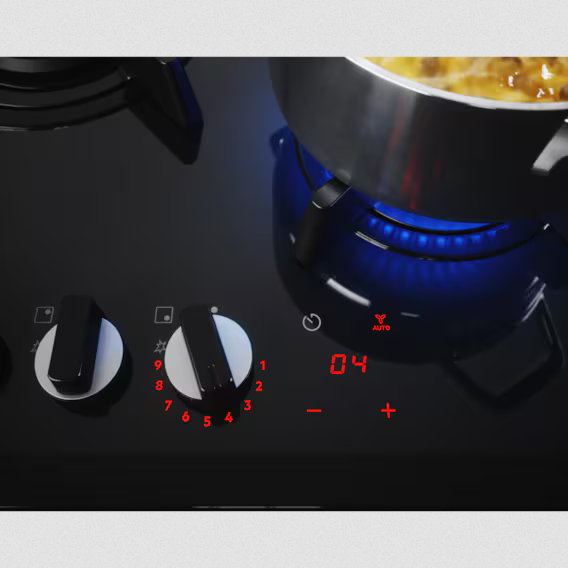 Jasne diody LED wyświetlacza FlameLight wyraźnie pokazują wielkość płomienia w zakresie od 1 do 9, dzięki czemu możesz łatwo sterować jego intensywnością podczas gotowania. Żywe kolory diod LED informują, czy palnik jest włączony.