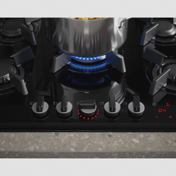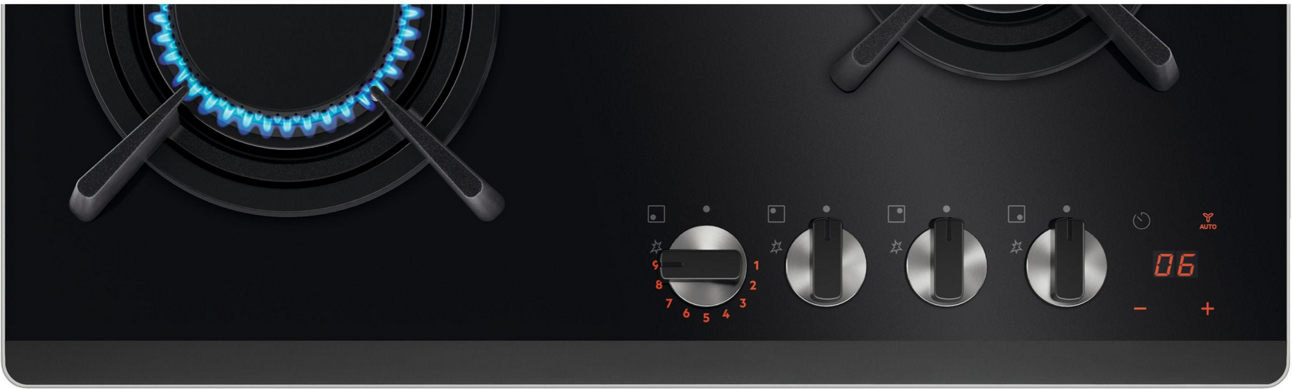 Jasne diody LED płyty gazowej FlameLight pokazują wielkość płomienia w zakresie od 1 do 9, dbając o komfort podczas gotowania. Żywe kolory diod LED przypominają o włączonych pokrętłach oraz informują, czy ruszty nad palnikami są jeszcze gorące.