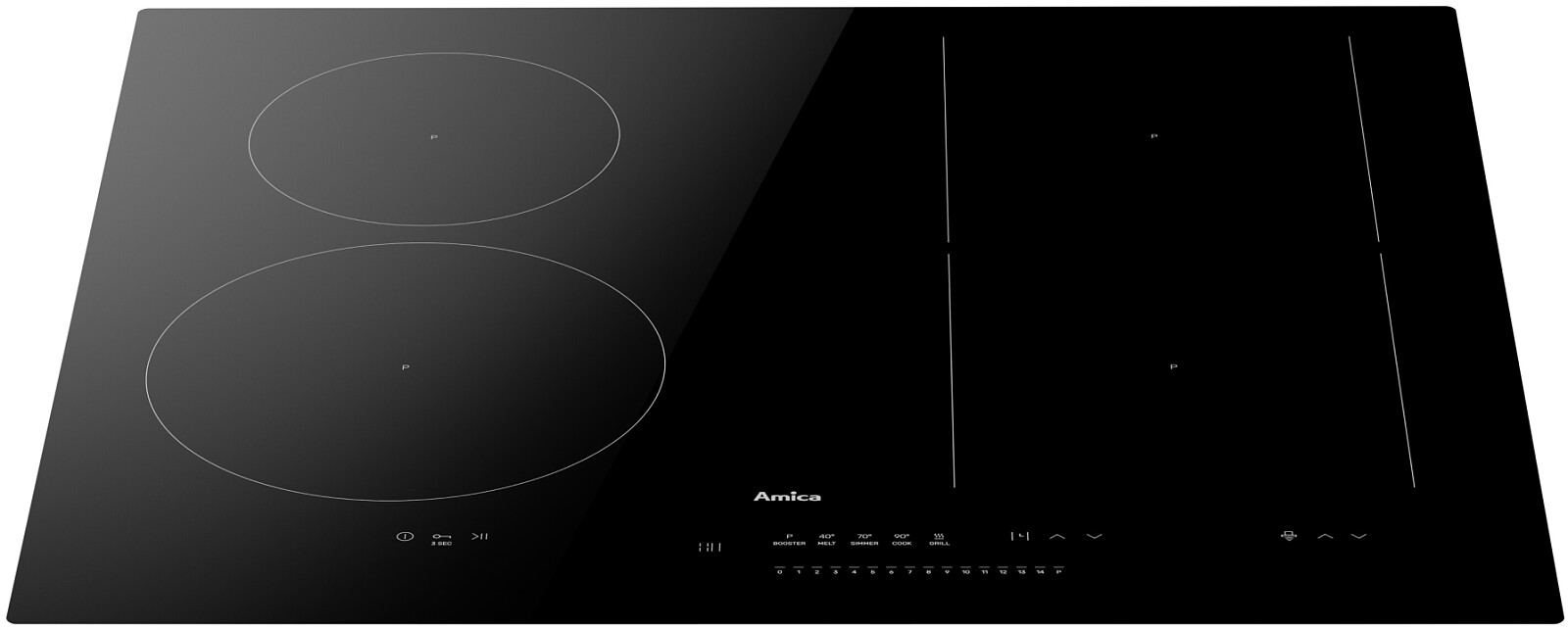 Płyty indukcyjne Amica możesz podłączyć do jedno- lub trójfazowej / każdej instalacji elektrycznej. Wybierz jeden z pięciu poziomów mocy i gotuj na wszystkich palnikach jednocześnie.