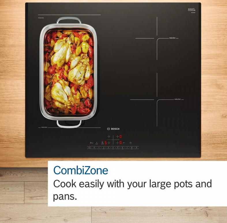 Dzięki płycie indukcyjnej CombiZone masz tę zaletę, że łączysz dwie strefy gotowania z równomiernym rozprowadzaniem ciepła, co zapewnia więcej miejsca i elastyczność podczas podgrzewania dużych naczyń, takich jak duże garnki lub blachy do pieczenia.